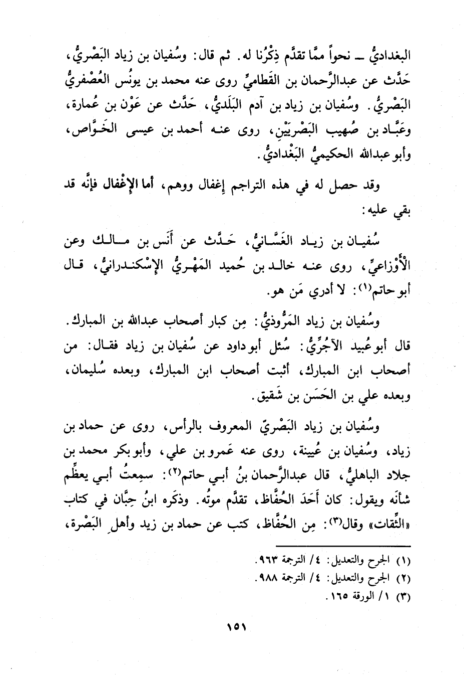 وسفيان بْن زياد البَصْرِيّ المعروف بالرأس، روى عن حماد بْن زياد، وسفيان بْن عُيَيْنَة، روى عنه عَمْرو بْن عَلِيٍّ، وأَبُو بَكْرِ مُحَمَّد بْن جلاد الباهلي، قال عَبْد الرَّحْمَنِ بْن أَبي حَاتِم (2) : سمعت أبي يعظم شأنه ويقول: كان أحد الحفاظ، تقدم موته. وذكره ابنُ حِبَّان في كتاب "الثقات" وَقَال (3) : من الحفاظ، كتب عن حماد بْن زيد وأهل البصرة،