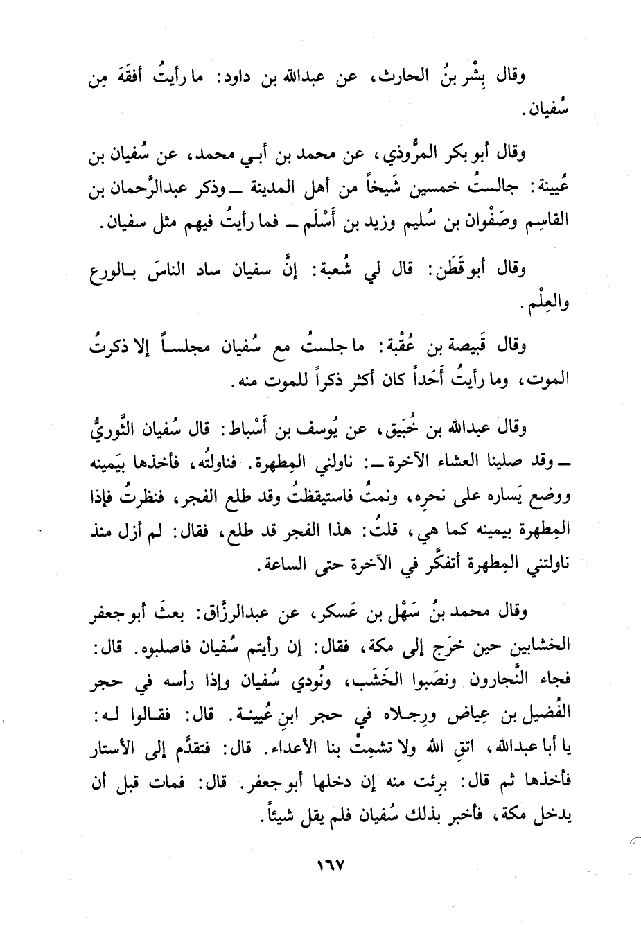 وَقَال بشر بْن الحارث، عَنْ عَبد اللَّهِ بْن داود: ما رأيت افقه من سفيان وَقَال أَبُو بَكْر المروذي، عَنْ مُحَمَّد بْن أَبي مُحَمَّد، عَنْ سفيان بْن عُيَيْنَة: جالست خمسين شيخا من أهل المدينة - وذكر عَبْد الرَّحْمَنِ بْن القاسم وصفوان بْن سليم وزيد بْن أسلم - فما رأيت فيهم مثل سفيان.