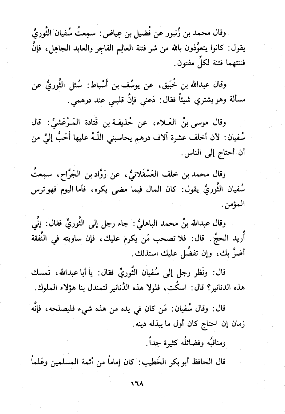 قال: وَقَال سفيان: من كان فِي يده من هذه شيء فليصلحه، فإنه زمان إن احتاج كان أول ما يبذله دينه.