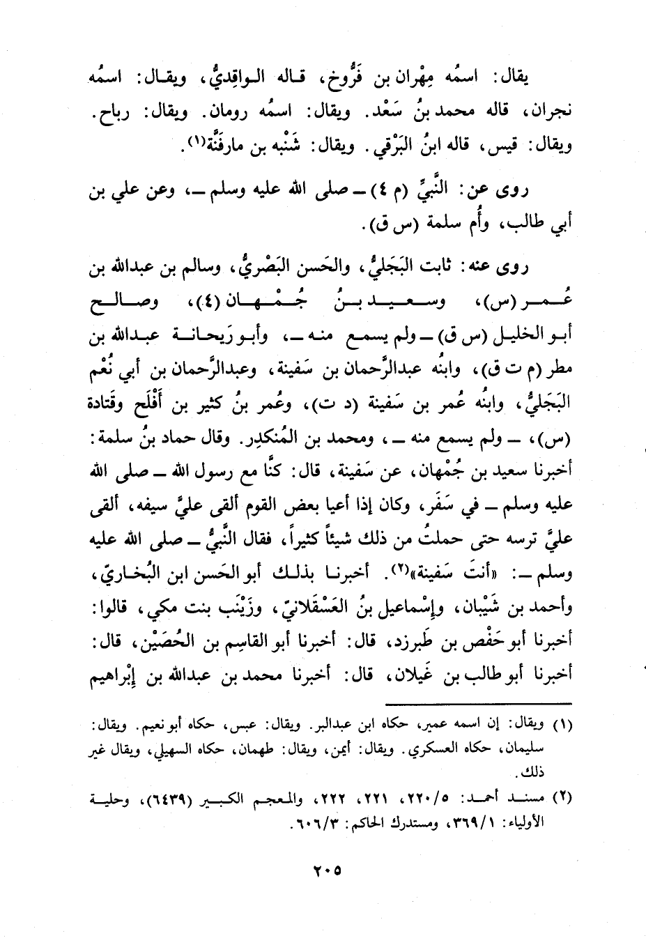 وَقَال حماد بْن سلمة: أَخْبَرَنَا سَعِيد بْن جمهان، عَنْ سفينة، قال: كنا مع رَسُول اللَّهِ صلى الله عليه وسَلَّمَ فِي سفر، وكان إذا أعيا بعض القوم ألقى علي سيفه، ألقى علي ترسه حَتَّى حملت من ذلك شيئا كثيرا، فَقَالَ النَّبِيُّ صَلَّى اللَّهُ عَلَيْهِ وسلم: أنت سفينة (2) . أَخْبَرَنَا بذلك أَبُو الْحَسَنِ بْنُ الْبُخَارِيِّ، وأحمد بْنُ شَيْبَانَ، وإِسْمَاعِيلُ بْنُ الْعَسْقَلانِيِّ، وزَيْنَبُ بِنْتُ مَكِّيٍّ، قَالُوا: أَخْبَرَنَا أبو حفص بن طَبَرْزَذَ، قال: أَخْبَرَنَا أبو القاسم بْن الحصين، قال: أخبرنا أَبُو طالب بْن غيلان، قال: أَخْبَرَنَا مُحَمَّد بْن عَبد اللَّهِ بْن إِبْرَاهِيم
