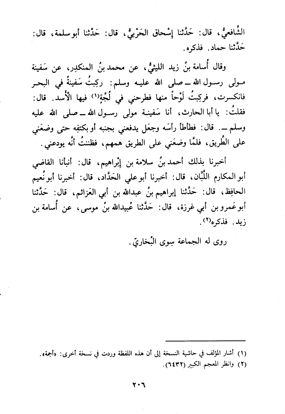 أَخْبَرَنَا بذلك أَحْمَد بْن سلامة بْن إِبْرَاهِيمَ، قال: أَنْبَأَنَا القاضي أَبُو المكارم اللبان، قال: أخبرنا أَبُو عَلِيّ الحداد، قال: أَخْبَرَنَا أبو نعيم الْحَافِظُ، قال: حَدَّثَنَا إِبْرَاهِيمُ بْنُ عَبد اللَّهِ بْن أَبي العزائم، قال: حَدَّثَنَا أَبُو عَمْرو بْنُ أَبي غرزة، قال: حَدَّثَنَا عُبَيد اللَّه بْن مُوسَى، عَنْ أسامة بْن زيد. فذكره (2) .
