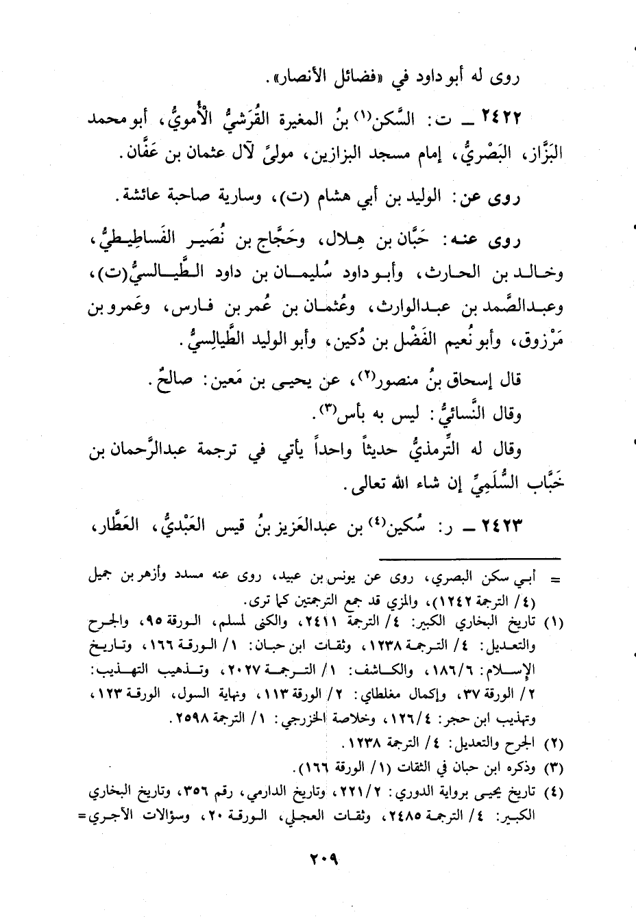 2422 - ت: السكن بن المغيرة الْقُرَشِيّ الأُمَوِي (1) ، أَبُو مُحَمَّد البزاز، البَصْرِيّ، إمام مسجد البزازين، مولى لآل عُثْمَان بْن عفان. رَوَى عَن: الوليد بْن أَبي هشام (ت) ، وسارية صاحبة عائشة.
