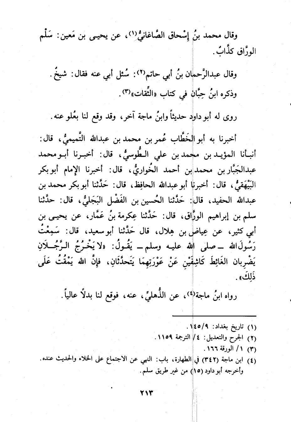 (4) ابن ماجة (342) في الطهارة، باب: النهي عن الاجتماع على الخلاء والحديث عنده. وأخرجه أبو داود (15) من غير طريق سلم.