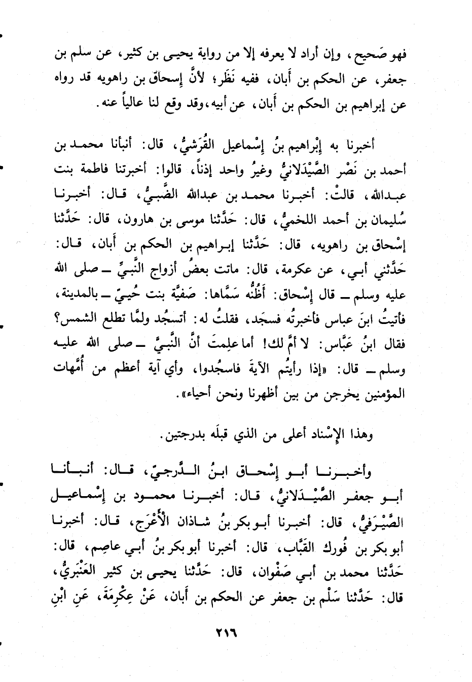أخبرنا بِهِ إِبْرَاهِيمُ بْنُ إِسْمَاعِيلَ الْقُرَشِيُّ، قال: أَنْبَأَنَا مُحَمَّد بْن أَحْمَد بْن نصر الصَّيْدَلانِيُّ وغَيْرُ واحِدٍ إِذْنا، قَالُوا: أَخْبَرَتْنا فَاطِمَةُ بِنْتُ عَبد اللَّهِ، قَالَتْ: أخبرنا مُحَمَّدُ بْنُ عَبد اللَّهِ الضَّبِّيُّ، قال: أخبرنا سُلَيْمان بْنُ أَحْمَدَ اللَّخْمِيُّ، قال: حَدَّثَنَا موسى بْن هارون، قال: حَدَّثَنَا إِسْحَاقُ بْنُ رَاهَوَيْهِ، قال: حَدَّثَنَا إِبْرَاهِيم بْن الحكم بْن أبان، قال: حَدَّثني أَبِي، عَنْ عِكْرِمَةَ، قال: مَاتَتْ بَعْضَ أَزْوَاجِ النَّبِيِّ صلى الله عليه وسلم قال إِسْحَاقُ: أَظُنُّهُ سَمَّاهَا: صَفِيَّةَ بِنْتَ حُيَيٍّ - بِالْمَدِينَةِ، فَأَتَيْتُ ابْنَ عَبَّاسٍ فَأْخَبَرْتُهُ فَسَجَدَ، فَقُلْتُ لَهُ: أَتَسْجُدُ ولَمَّا تَطْلُعِ الشَّمْسُ؟ فَقَالَ ابْنُ عَبَّاسٍ: لا أَمَ لَكَ! أَمَا عَلِمْتَ أَنَّ النَّبِيَّ صَلَّى اللَّهُ عَلَيْهِ وَسَلَّمَ قال: إِذَا رَأَيْتُمُ الآيَةَ فَاسْجُدُوا، وأَيُّ آيَةٍ أَعْظَمُ مِنْ أُمَّهَاتِ الْمُؤْمِنِينَ يَخْرُجْنَ مِنْ بَيْنَ أَظْهُرِنَا ونَحْنُ أَحْيَاءٌ.