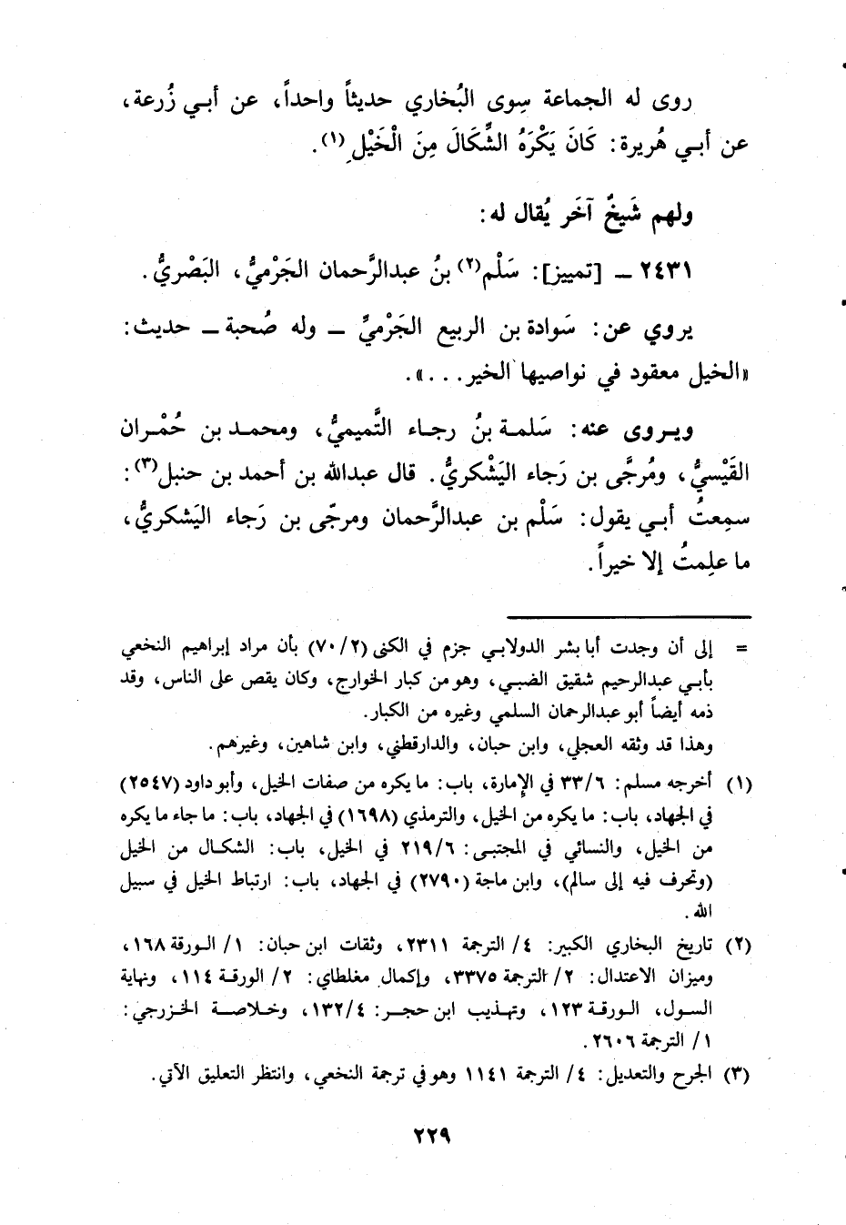 2431 - تمييز سلم بن عَبْد الرَّحْمَنِ الجرمي (2) ، البَصْرِيّ، يروي عَن: سوادة بْن الربيع الجرمي - وله صحبة - حديث: الخيل معقود فِي نواصيها الخير....
