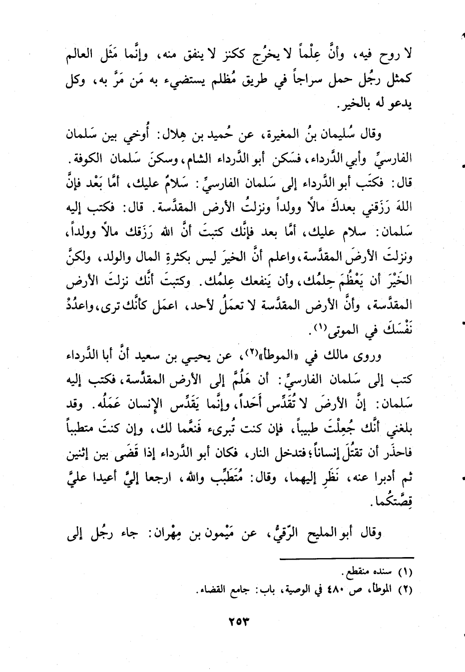وَقَال سُلَيْمان بْن المغيرة، عَنْ حميد بْن هلال: اوخي بين سلمان الفارسي وأَبي الدَّرْدَاء، فسكن أَبُو الدرداء الشام، وسكن سلمان الكوفة. قال: فكتب أَبُو الدرداء إِلَى سلمان الفارسي: سلام عليك، أما بعد فإن اللَّه رزقني بعدك مالا وولدا ونزلت الأرض المقدسة. قال: فكتب إليه سلمان: سلام عليك، أما بعد فإنك كتبت إن اللَّه رزقك مالا وولدا"، ونزلت الأرض المقدسة، وأعلم إن الخير ليس بكثرة المال والولد، ولكن الخير إن يعظم حلمك، وأن يفعك علمك. وكتبت أنك نزلت الأرض المقدسة، وأن الأرض المقدسة لا تعمل لأحد، أعمل كأنك ترى، وأعدد نفسك فِي الموتى (1) .