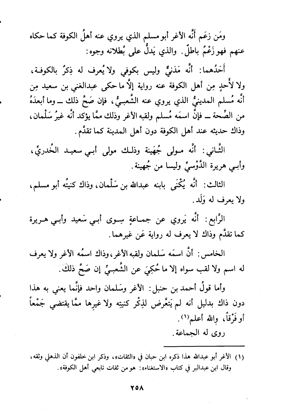 وأما قول أَحْمَد بْن حَنْبَل: الأَغَر وسلمان واحد فإنما يعني بِهِ هذا دون ذاك بدليل أَنَّهُ لم يتعرض لذكر كنيته ولا غيرها مما يقتضي جمعا أو فرقا، والله أعلم (1) .