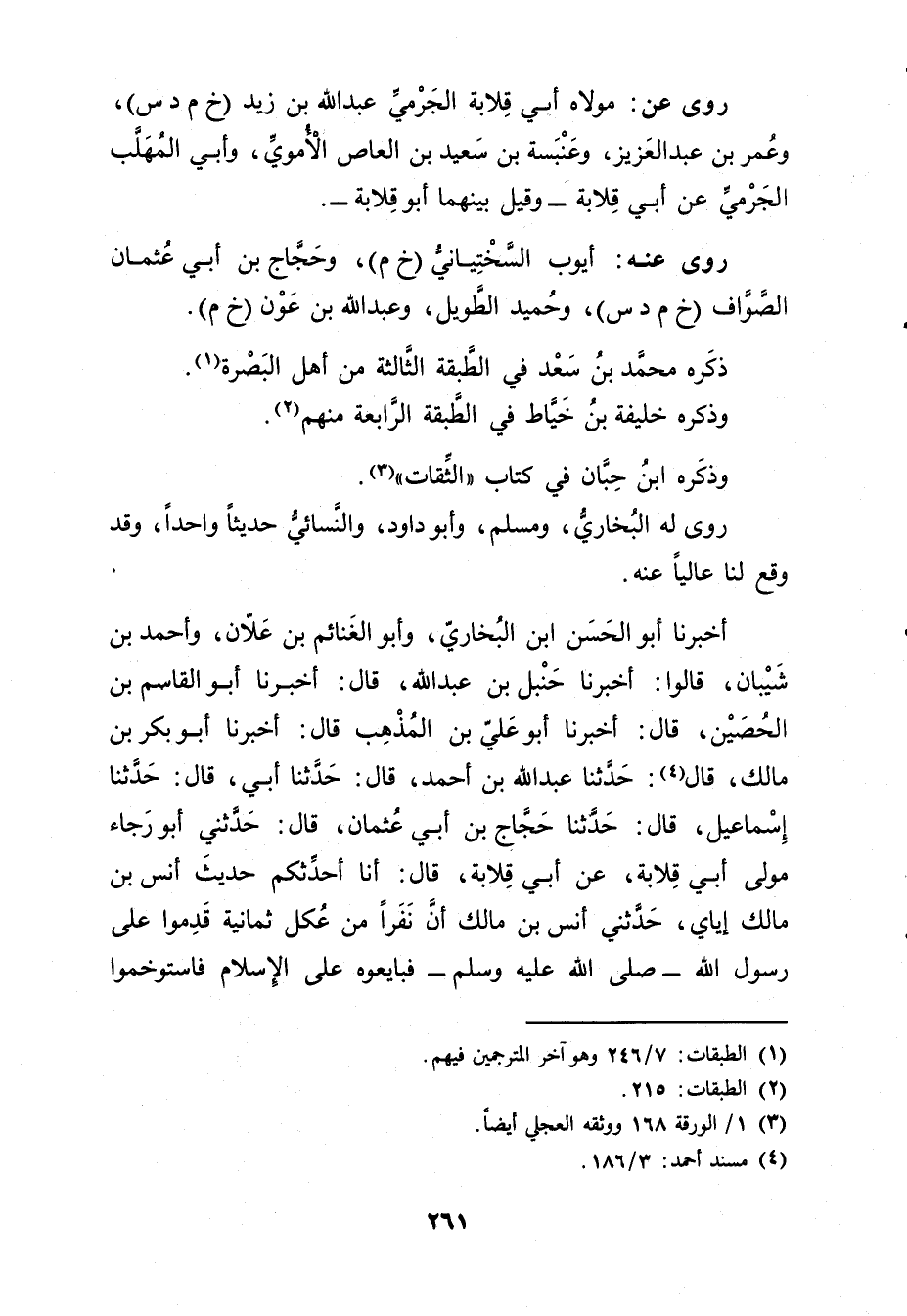 أَخْبَرَنَا أَبُو الْحَسَنِ بْنُ الْبُخَارِيِّ، وأَبُو الْغَنَائِمِ بْنُ عَلانَ، وأَحْمَدُ بْنُ شَيْبَانَ، قَالُوا: أَخْبَرَنَا حنبل بْن عَبد الله، قال: أَخْبَرَنَا أبو القاسم بْن الحصين، قال: أَخْبَرَنَا أبو علي بْن المذهب قال: أَخْبَرَنَا أبو بكر بْن مالك، قال (4) : حَدَّثَنَا عَبد اللَّهِ بْن أَحْمَدَ، قال: حَدَّثَنَا أَبِي، قال: حَدَّثَنَا إِسْمَاعِيلُ، قال: حَدَّثَنَا حَجَّاجُ بْنُ أَبي عُثْمَانَ، قال: حَدَّثَنِي أَبُو رَجَاءَ مَوْلَى أَبِي قُلابَةَ، عَن أَبِي قُلابَةَ، قال: أَنَا أُحَدِّثُكُمْ حَدِيثَ أَنَسِ بْنِ مَالِكٍ إِيَّايَ، حَدَّثَنِي أَنَسُ بْنُ مَالِكٍ أَنَّ نَفَرًا مِنْ عُكَلٍ ثَمَانِيَةً قَدِمُوا عَلَى رَسُول اللَّهِ صلى الله عليه وسَلَّمَ فَبَايَعُوهُ عَلَى الإِسْلامِ فَاسْتَوْخَمُوُا