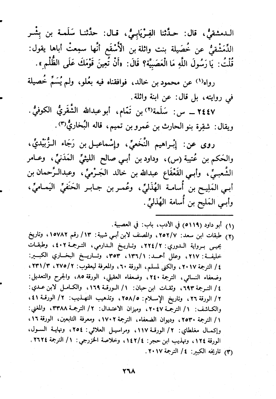 الدمشقي، قال: حَدَّثَنَا الفريابي، قال: حَدَّثَنَا سلمة بْن بشر الدمشقي عَنْ خصيلة بنت واثلة بْن الأسقع أنها سمعت أباها يَقُولُ: قُلْتُ: يَا رَسُولَ اللَّهِ مَا العصبية؟ قال: إن تعين قومك عَلَى الظلم.