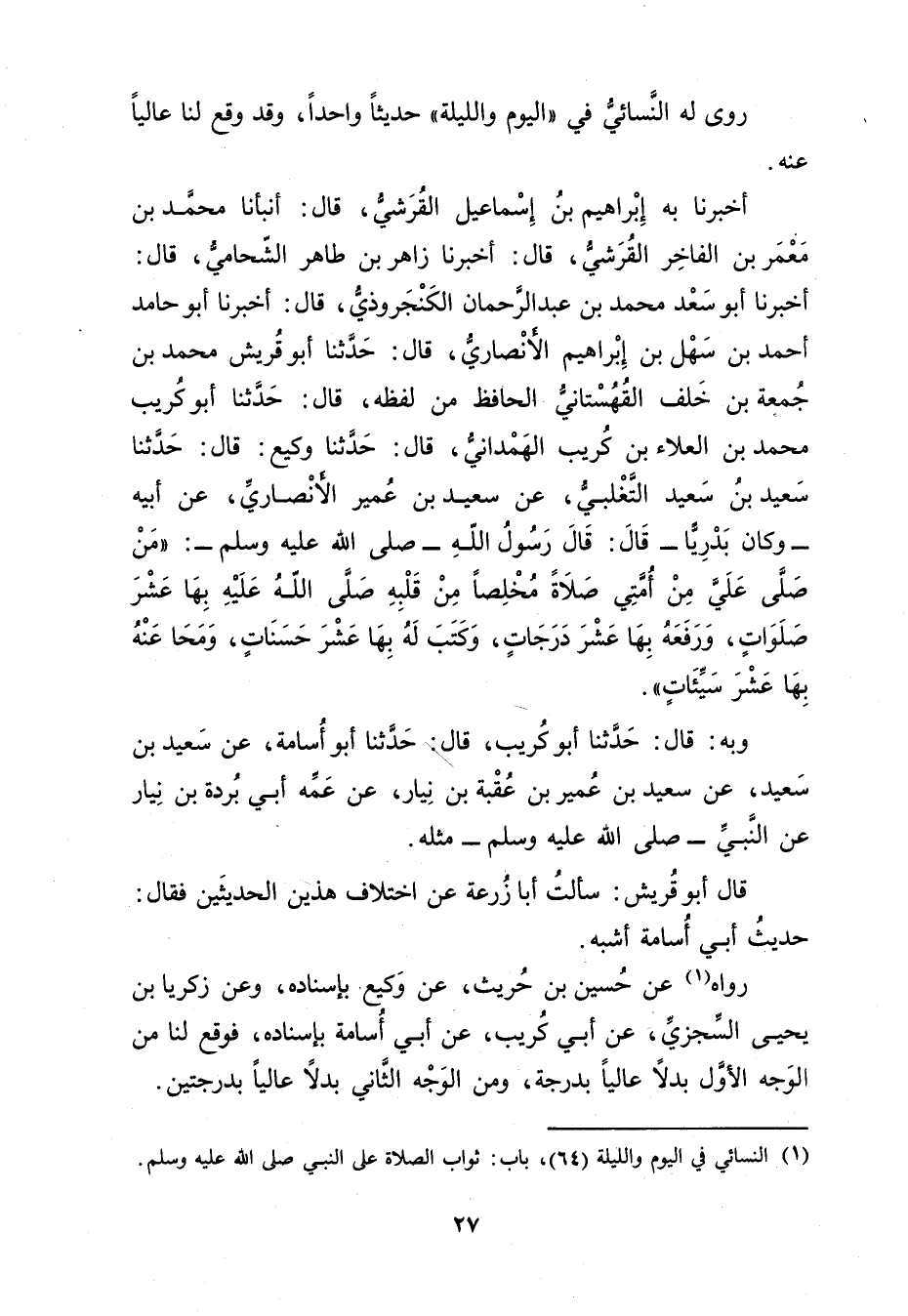 يحيى السجزي، عَن أبي كريب، عَن أبي أسامة بإسناده، فوقع لنا من الوجه الأول بدلا عاليا بدرجة، ومن الوجه الثاني بدلاً عالياً بدرجتين.