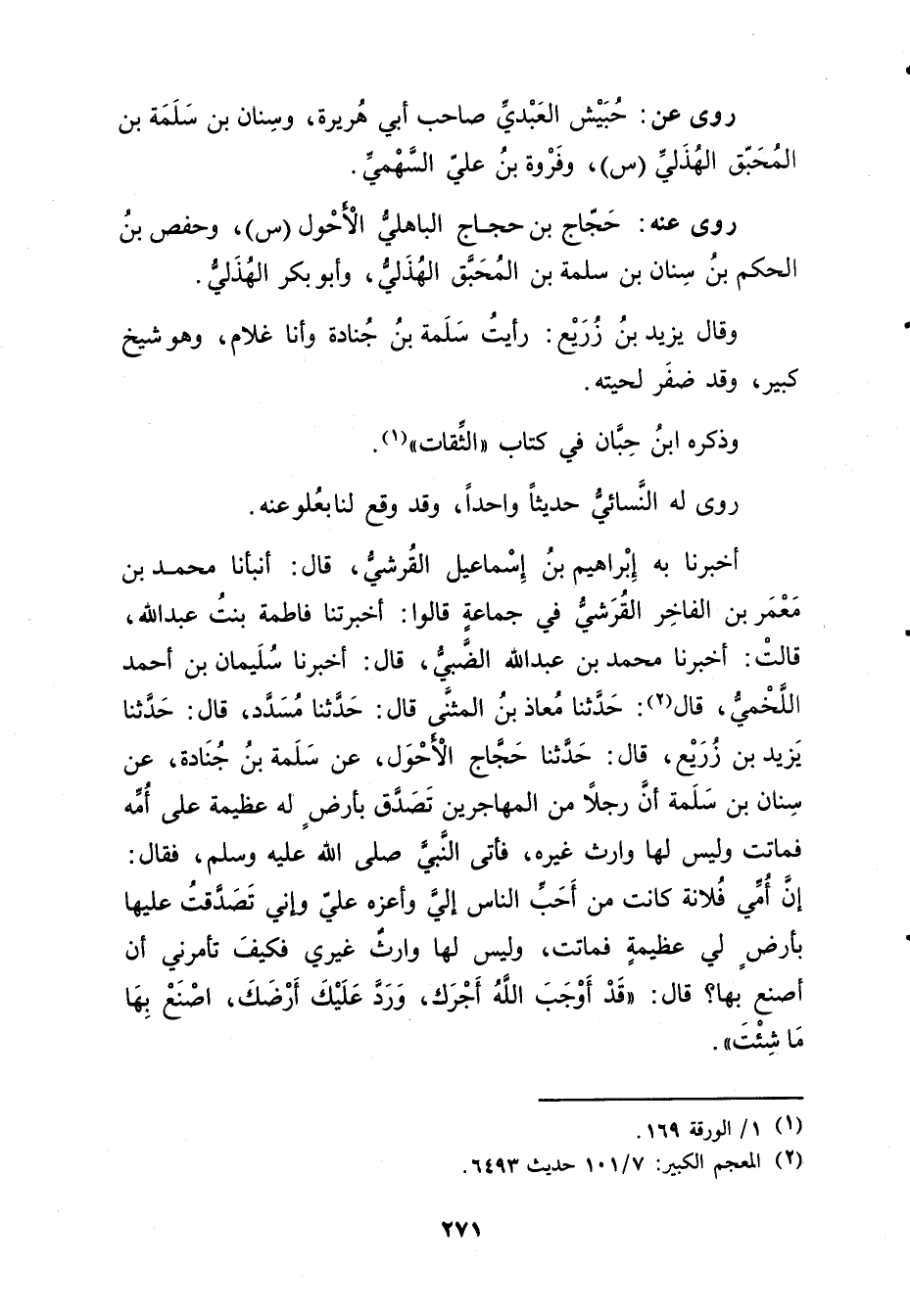 أَخْبَرَنَا بِهِ إِبْرَاهِيمُ بْنُ إِسْمَاعِيلَ الْقُرَشِيُّ، قال: أَنْبَأَنَا مُحَمَّدُ بْنُ مَعْمَرِ بْنِ الْفَاخِرِ الْقُرَشِيُّ فِي جَمَاعَةٍ قَالُوا: أَخْبَرَتْنا فَاطِمَةُ بِنْتُ عَبد اللَّهِ، قَالَتْ: أخبرنا مُحَمَّدُ بْنُ عَبد اللَّهِ الضَّبِّيُّ، قال: أخبرنا سُلَيْمان بْنُ أَحْمَدَ اللَّخْمِيُّ، قال (2) : حَدَّثَنَا مُعَاذُ بْنُ الْمُثَنَّى قال: حَدَّثَنَا مُسَدَّدٌ، قال: حَدَّثَنَا يَزِيدُ بْنُ زُرَيْعٍ، قال: حَدَّثَنَا حَجَّاجٌ الأَحْوَلُ، عَنْ سَلَمَةَ بْنِ جُنَادَةَ، عَنْ سِنَانِ بْنِ سَلَمَةَ أَنَّ رَجُلا مِنَ الْمُهَاجِرِينَ تَصَدَّقَ بِأَرْضٍ لَهُ عَظِيمَةٍ عَلَى أُمِّهِ فَمَاتَتْ ولَيْسَ لَهَا وارِثٌ غَيْرُهُ، فَأَتَى النَّبِيُّ صلى الله عليه وسلم، فَقَالَ: إِنَّ أُمِّي فُلانَةً كَانَتْ من أحب الناس إلي وأعزه عَلَيَّ وإِنِّي تَصَدَّقْتُ عَلَيْهَا بِأَرْضٍ لِي عَظِيمَةٍ فَمَاتَتْ، ولَيْسَ لَهَا وارِثٌ غَيْرِي فَكَيْفَ تَأْمُرْنِي أَنْ أَصْنَعَ بِهَا؟ قال: قَدْ أَوْجَبَ اللَّهُ أَجْرَكَ، ورَدَّ عَلَيْكَ أَرْضَكَ، أصنع بها ما شئت.
