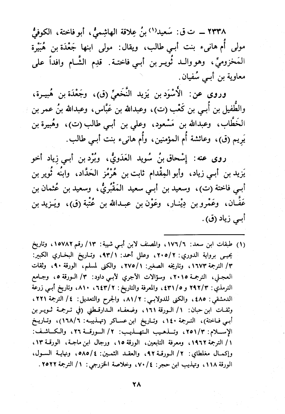 2338 - ت ق: سَعِيد بن علاقة الهاشمي (1) ، أَبُو فاخته، الكوفي مولى أم هانئ بنت أبي طالب، ويُقال: مولى ابنها جعدة بْن هبيرة المخزومي، وهو والد ثوير بْن أَبي فاخته. قدم الشام وافدا عَلَى معاوية بْن أَبي سفيان.
