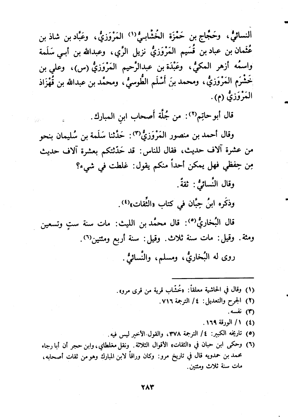 (6) وحكى ابن حبان في "الثقات" الاقوال الثلاثة. ونقل مغلطاي، وابن حجر أن أبا رجاء محمد بن حمدويه قال في تاريخ مرو: وكان وراقا لابن المبارك وهو من ثقات أصحابه، مات سنة ثلاث ومئتين.