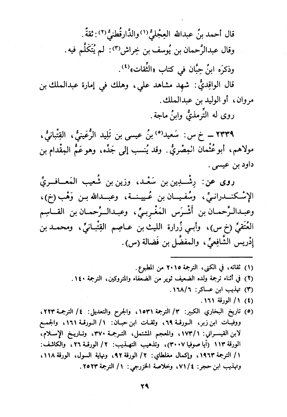 2339 - خ س: سَعِيد بن عيسى بن تليد الرعيني (5) ، القتباني، مولاهم، أَبُو عُثْمَان المِصْرِي. وقد ينسب إِلَى جَدِّه، وهو عم المقدام بْن داود بْن عيسى.