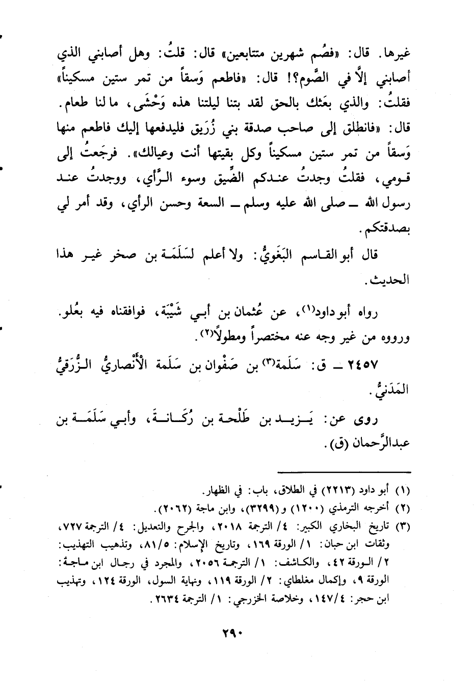 غَيْرَهَا. قال: فَصُمْ شَهْرَيْنِ مُتَتَابِعَيْنِ"قال: قُلْتُ: وهَلْ أَصَابَنِي الَّذِي أَصَابَنِي إِلا فِي الصَّوْمِ؟ ! قال: فَأَطْعِمْ وسَقًا مِنْ تَمْرٍ سِتِّينَ مِسْكِينًا"فَقُلْتُ: والَّذِي بَعَثَكَ بِالْحَقِّ لَقَدْ بِتْنَا لَيْلَتَنَا هَذِهِ وحْشَى، مَا لَنَا طَعَامٌ. قال: فَانْطَلِقْ إِلَى صَاحِبِ صَدَقَةِ بَنِي زُرَيْقٍ فَلْيَدْفَعْهَا إِلَيْكَ فَأَطْعِمْ مِنْهَا وسَقًا مِنْ تَمْرٍ سِتِّينَ مِسْكِينًا وكُلْ بَقِيَّتَهَا أَنْتَ وعِيَالُكَ". فَرَجَعْتُ إِلَى قَوْمِي، فَقُلْتُ وجَدْتُ عِنْدَكُمُ الضِّيقَ وسُوءَ الرَّأْيِ، ووَجَدْتُ عِنْدَ رَسُولِ اللَّهِ صلى الله عليه وسلم السَّعَةَ وحُسْنَ الْرَأْيِ، وقَدْ أَمَرَ لِي بِصَدَقَتِكُمْ.