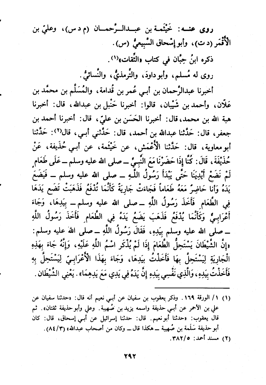 أَخْبَرَنَا عَبْدُ الرَّحْمَنِ بْنُ أَبي عُمَر بْنِ قُدَامَةَ، والْمُسَلَّمُ بْنُ مُحَمَّدِ بْنِ عَلانَ، وأَحْمَدُ بْنُ شَيْبَانَ، قَالُوا: أَخْبَرَنَا حَنْبَلُ بْن عَبد الله، قال: أَخْبَرَنَا هِبَةُ اللَّهِ بْنُ مُحَمَّدٍ، قال: أخبرنا الحسن بن علي، قا ل: أخبرنا أَحْمَدُ بْنُ جَعْفَرٍ، قال: حَدَّثَنَا عَبد اللَّهِ بْنُ أَحْمَدَ، قال: حَدَّثني أبي، قال: (2) : حَدَّثَنَا أَبُو مُعَاوِيَةُ، قال: حَدَّثَنَا الأَعْمَشُ، عَنْ خَيْثَمَةَ، عَن أَبِي حُذَيْفَةَ، عَنْ حُذَيْفَةَ، قال: كُنَّا إِذَا حَضَرْنَا مَعَ النَّبِيِّ صَلَّى اللَّهُ عَلَيْهِ وسَلَّمَ عَلَى طَعَامٍ لَمْ نَضَعْ أَيْدِينَا حَتَّى يَبْدَأُ رَسُولُ اللَّهِ صلى الله عليه وسلم فَيَضَعُ يَدَهُ وأَنَا حَاضِرٌ مَعَهُ طَعَامًا فَجَاءَتْ جَارِيَةٌ كَأَنَّمَا تُدْفَعُ فَذَهَبَتْ تَضَعُ يَدَهَا فِي الطَّعَامِ فَأَخَذَ رَسُولُ اللَّهِ صَلَّى اللَّهُ عَلَيْهِ وسَلَّمَ بِيَدِهَا، وجَاءَ أَعْرَابِيٌّ وكَأَنَّمَا يُدْفَعُ فَذَهَبَ يَضَعُ يَدَهُ فِي الطَّعَامِ فَأَخَذَ رَسُولُ اللَّهِ صَلَّى اللَّهُ عَلَيْهِ وسَلَّمَ بِيَدِهِ، فَقَالَ رَسُولُ اللَّهِ صلى الله عَلَيْهِ وسَلَّمَ: إِنَّ الشَّيْطَانَ يَسْتَحِلُ الطَّعَامَ إِذَا لَمْ يُذْكَرِ اسْمُ اللَّهِ عَلَيْهِ، وأَنَّهُ جَاءَ بِهَذِهِ الْجَارِيَةِ لِيَسْتَحِلَّ بِهَا فَأَخَذْتُ بِيَدِهَا، وجَاءَ بِهَذَا الأَعْرَابِيِّ لِيَسْتَحِلَّ بِهِ فَأَخَذْتُ بِيَدِهِ، والَّذِي نَفْسِي بِيَدِهِ إِنَّ يَدَهُ فِي يَدِي مَعَ يدهما". يعني الشيطان