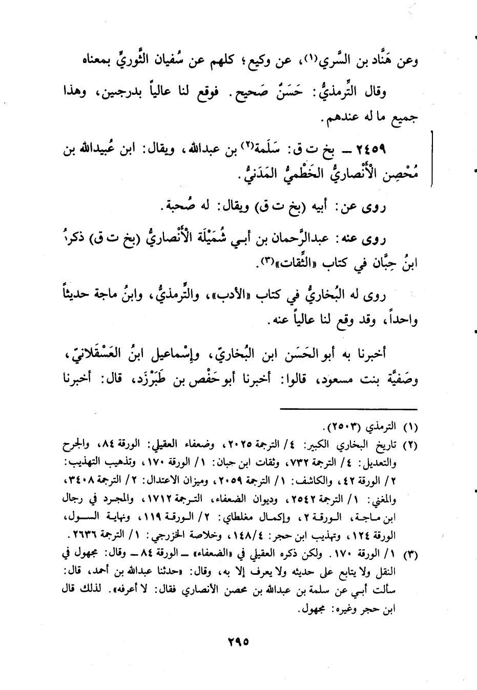 (3) 1 / الورقة 170. ولكن ذكره العقيلي في "الضعفاء - الورقة 84 - وَقَال: مجهول في النقل ولا يتابع على حديثه ولا يعرف إلا به، وَقَال: حَدَّثَنَا عَبد الله بن أحمد، قال: سَأَلتُ أبي عن سلمة بن عَبد الله بن محصن الأَنْصارِيّ فقال: لا أعرفه". لذلك قال ابن حجر وغيره: مجهول