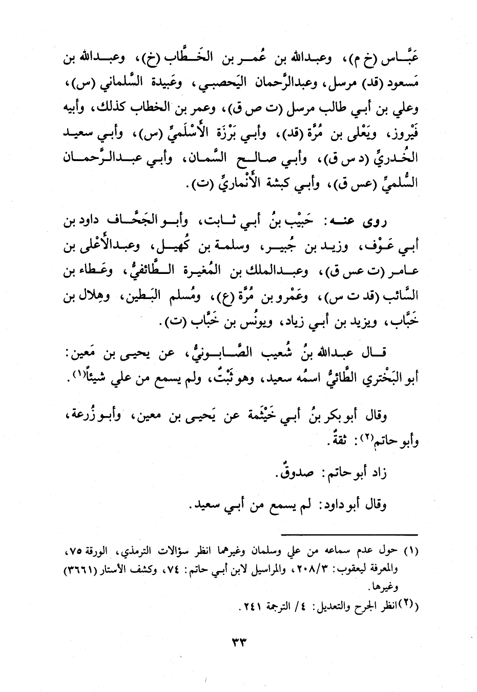 (1) حول عدم سماعه من علي وسلمان وغيرهما انظر سؤالات التِّرْمِذِيّ، الورقة 75، والمعرفة ليعقوب: 2 / 208، والمراسيل لابن أَبي حاتم: 74، وكشف الاستار (3661) وغيرها.