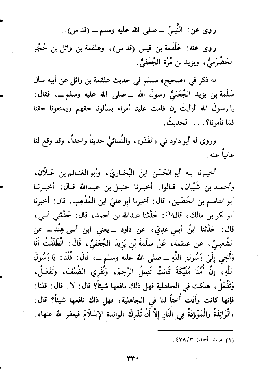 أخبرنا بِهِ أَبُو الْحَسَنِ بْنُ الْبُخَارِيِّ، وأَبُو الْغَنَائِمِ بْنُ عَلانَ، وأَحْمَدُ بْنُ شَيْبَانَ، قَالُوا: أَخْبَرَنَا حنبل بْن عَبد الله قال: أَخْبَرَنَا أبو القاسم بْن الحصين، قال: أَخْبَرَنَا أَبُو عَلِيِّ ابْنُ الْمُذْهِب، قال: أَخْبَرَنَا أبو بكر بْن مالك، قال (1) : حَدَّثَنَا عَبد اللَّهِ بْن أَحْمَدَ، قال: حَدَّثني أَبِي، قال: حَدَّثَنَا ابْنُ أَبي عَدِيٍّ، عَنْ دَاوُدَ، يَعْنِي ابْنَ أَبي هِنْدَ، عَن الشَّعْبِيِّ، عَنْ عَلْقَمَةَ، عَنْ سَلَمَةَ بْنِ يَزِيدَ الْجَعْفِيِّ، قال: انْطَلَقْتُ أَنَا وأَخِي إِلَى رَسُولِ اللَّهِ صَلَّى اللَّهُ عَلَيْهِ وسَلَّمَ، قال: قُلْنَا: يَا رَسُولَ اللَّهِ، إِنَّ أُمَّنَا مُلَيْكَةَ كَانَتْ تَصِلُ الرَّحِمَ، وتُقْرِي الضَّيْفَ، وتَفْعَلُ، وتَفْعَلُ، هَلَكَتْ فِي الْجَاهِلِيَّةِ فهل ذلك الرَّحِمَ، وتُقْرِي الضَّيْفَ، وتَفْعَلُ، وتَفْعَلُ، هَلَكَتْ فِي الْجَاهِلِيَّةِ فَهَلْ ذَلِكَ نَافِعُهَا شَيْئًا؟ قال: لا. قال: قُلْنَا: فَإِنَّهَا كَانَتْ وأَدَتْ أُخْتًا لَنَا فِي الْجَاهِلِيَّةِ، فَهَلْ ذَاكَ نافعها شيئاً؟ قال: الوائدة والموؤدة فِي النَّارِ إِلا أَنْ تُدْرِكَ الْوَائِدَةُ الإِسْلامَ فَيَعْفُو اللَّهَ عَنْهَا"
