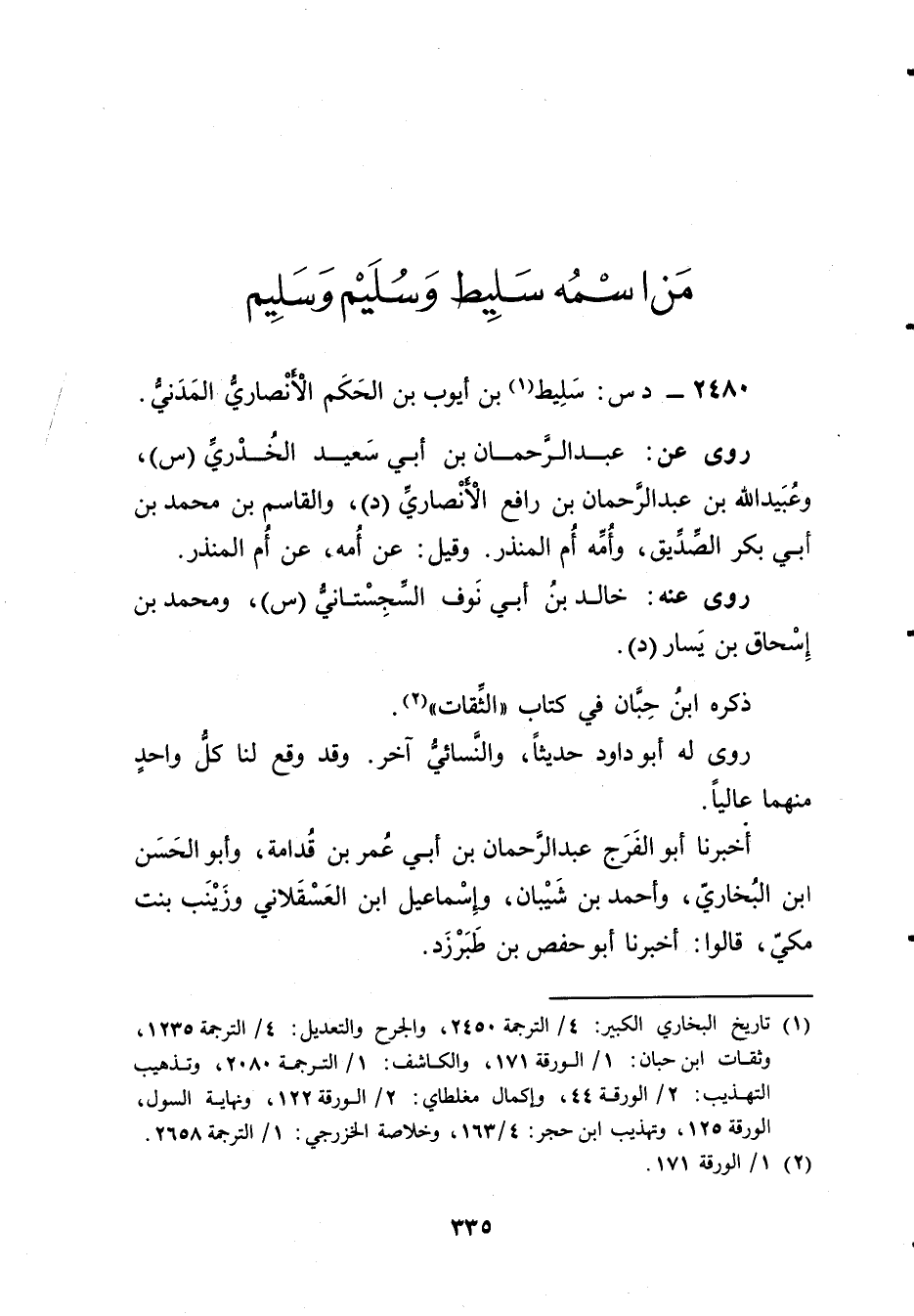 (1) تاريخ البخاري الكبير: 4 / الترجمة 2450، والجرح والتعديل: 4 / الترجمة 1235، وثقات ابن حبان: 1 / الورقة 171، والكاشف: 1 / الترجمة 2080، وتذهيب التهذيب: 2 / الورقة 44، وإكمال مغلطاي: 2 / الورقة 122، ونهاية السول، الورقة 125، وتهذيب ابن حجر: 4 / 163، وخلاصة الخزرجي: 1 / الترجمة 2658.