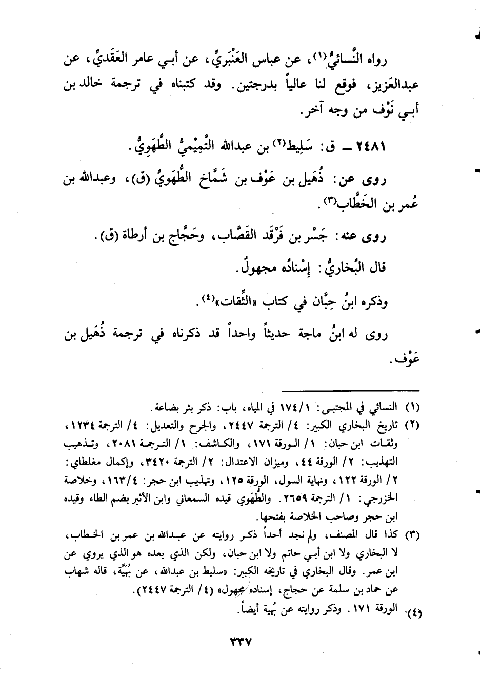 (3) كذا قال المصنف، ولم نجد أحدًا ذكر روايته عن عَبد الله بن عُمَر بن الخطاب، لا البخاري ولا ابن أَبي حاتم ولا ابن حبان، ولكن الذي بعده هو الذي يروي عن ابن عُمَر. وقَال البُخارِيُّ في تاريخه الكبير: سليط بن عَبد الله، عن بهية، قاله شهاب عن حماد بن سلمة بن عن حجاج، إسناده مجهول" (4 / الترجمة 2447) .
