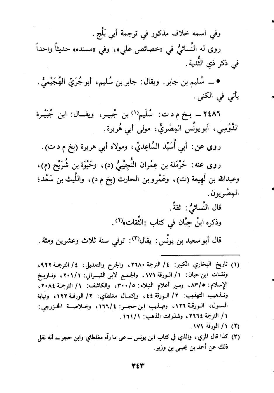 2486 - بخ م د ت: سليم بن جبير (1) ، ويُقال: ابن جبيرة الدوسي، أَبُو يونس المِصْرِي، مولى أبي هُرَيْرة.