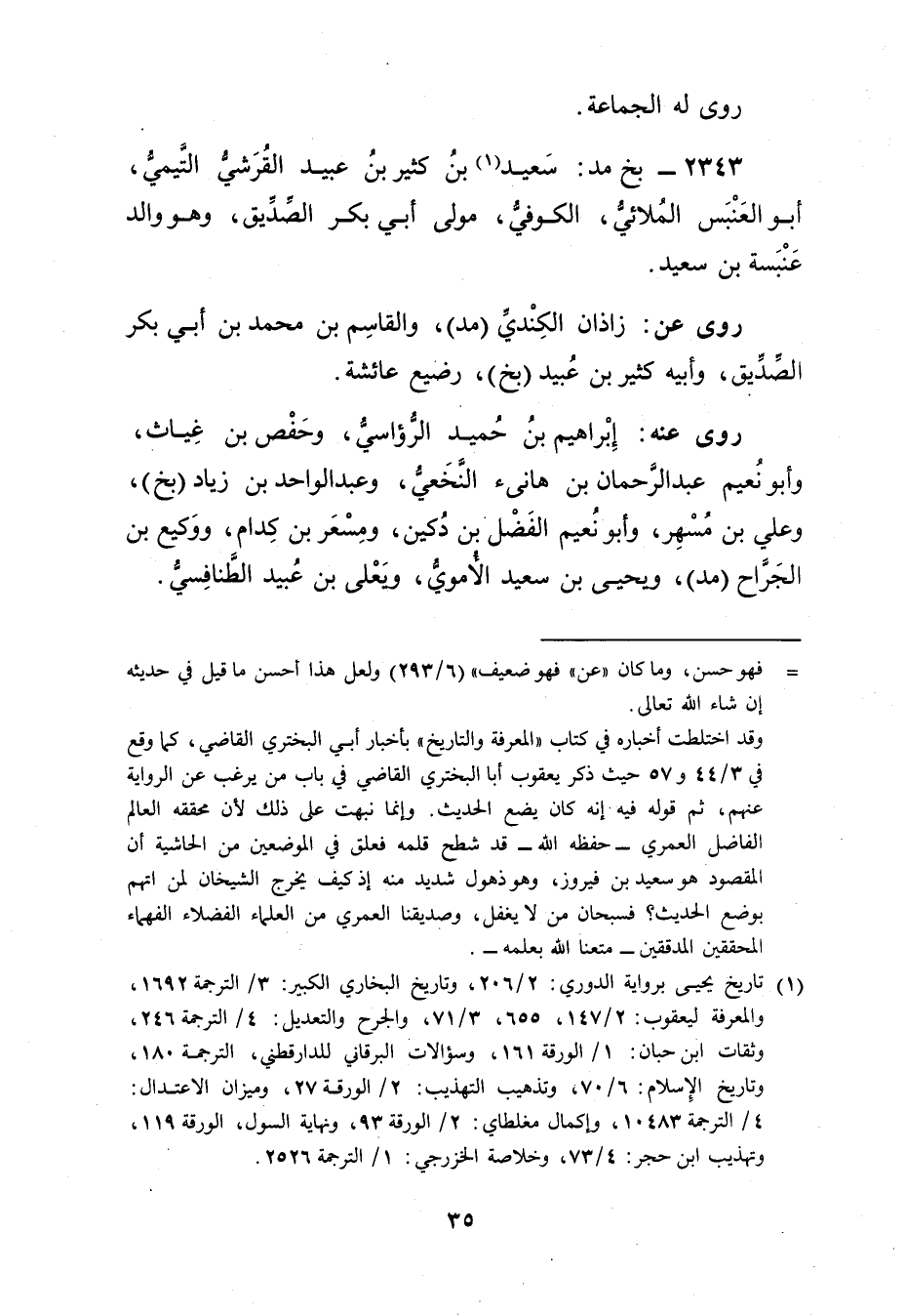 2343 - بخ مد: سَعِيد بن كثير بن عُبَيد الْقُرَشِيّ التَّيْمِيّ (1) ، أَبُو العنبس الملائي، الكوفي، مولى أَبِي بَكْرٍ الصديق، وهو والد عنبسة بْن سَعِيد.