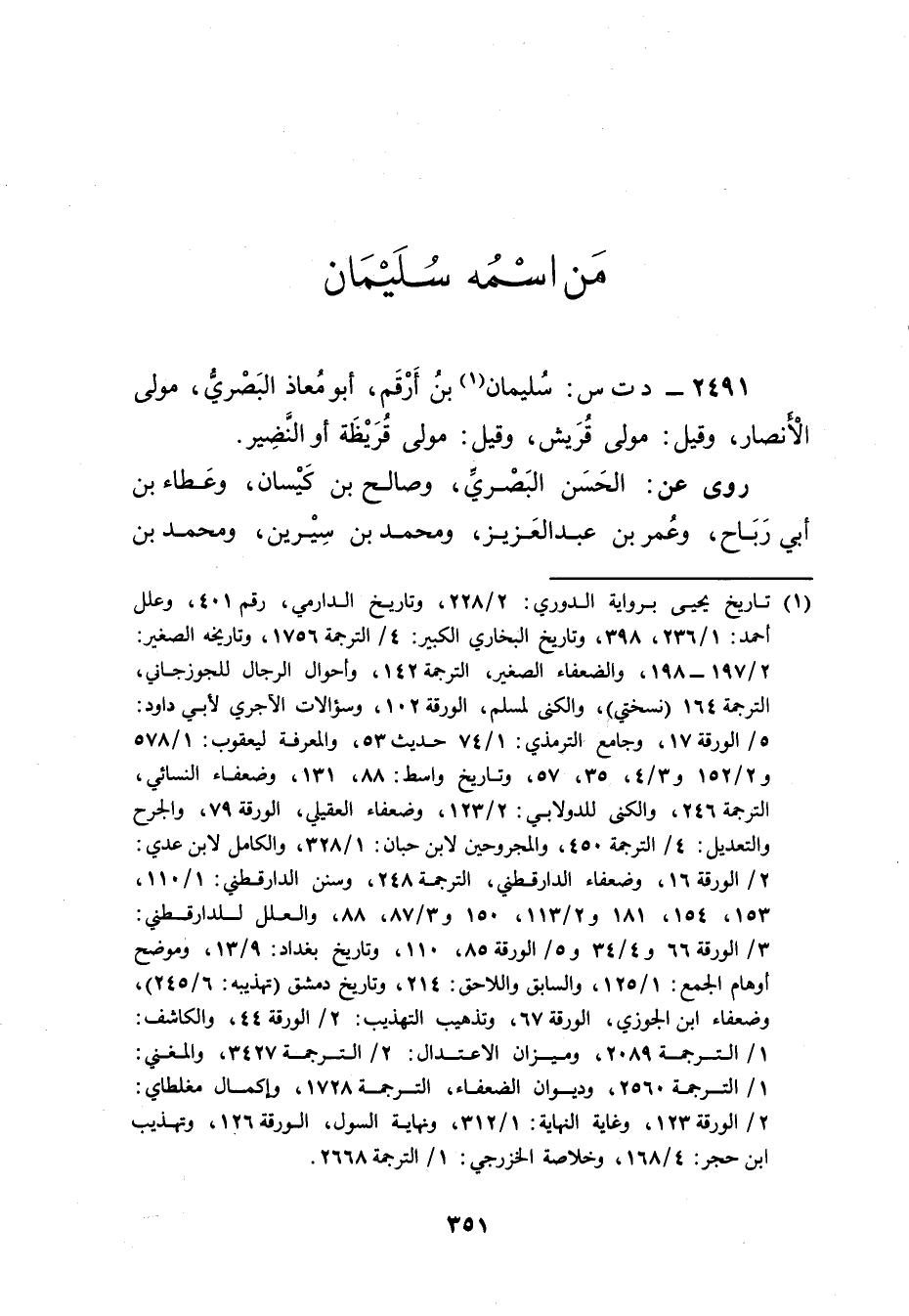 2491 - د ت س: سُلَيْمان بن أرقم (1) ، أَبُو معاذ البَصْرِيّ، مولى الأنصار، وقيل: مولى قريش، وقيل: مولى قريظة أو النضير.