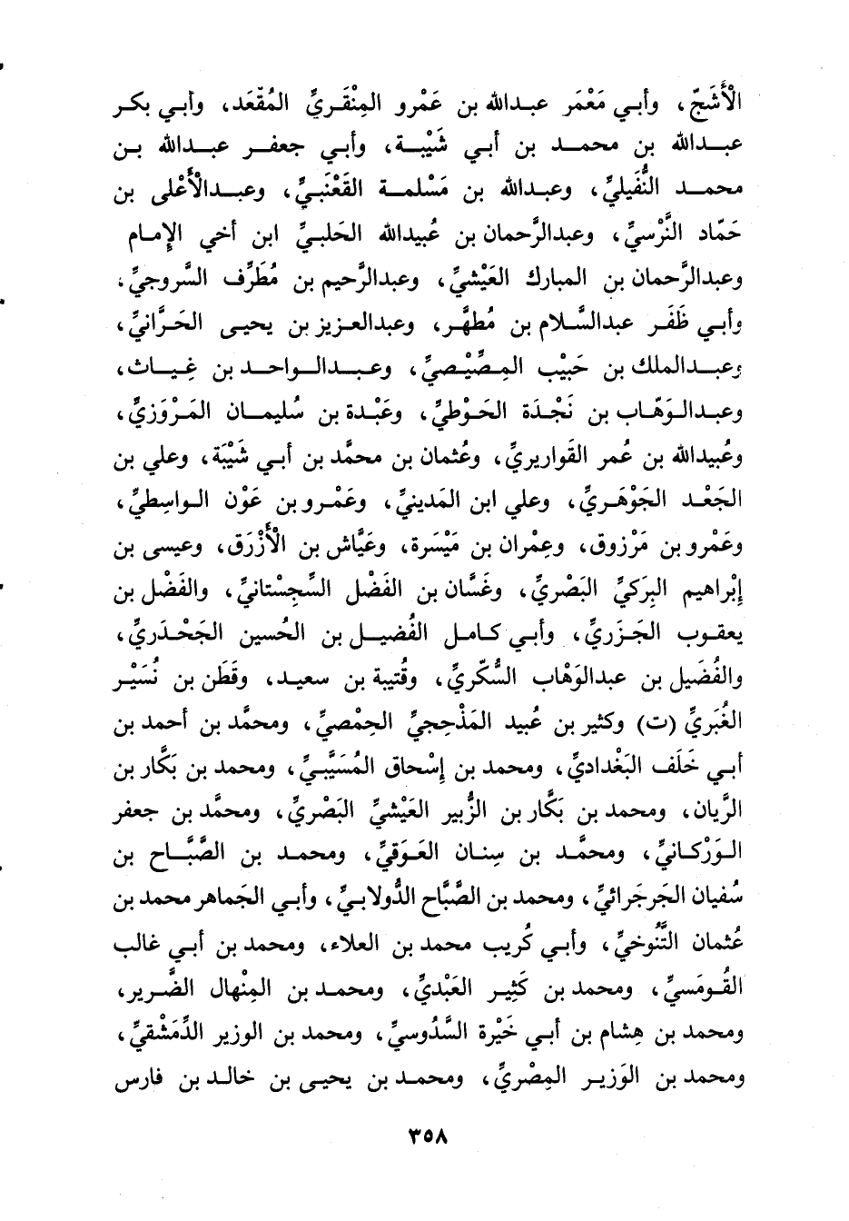 الأشج، وأبي معمر عَبد اللَّهِ بْن عَمْرو المنقري المقعد، وأَبِي بَكْر عَبد اللَّهِ بْن مُحَمَّد بْن أَبي شَيْبَة، وأبي جَعْفَر عَبد الله بْن مُحَمَّد النفيلي، وعَبد الله بْن مسلمة القعنبي، وعبد الأعلى بْن حَمَّاد النرسي، وعبد الرحمن بْن عُبَيد اللَّهِ الحلبي ابْن أخي الإمام وعَبْد الرَّحْمَنِ بْن المبارك العيشي، وعَبْد الرَّحِيمِ بْن مطرف السروجي. وأبي ظفر عبد السلام بْن مطهر، وعبد العزيز بْن يحيى الحراني، وعبد الملك بْن حبيب المصيصي، وعبد الواحد بْن غياث، وعبد الوهاب بْن نجده الحوطي، وعبدة بْن سُلَيْمان المروزي، وعُبَيد اللَّه بْن عُمَر القواريري، وعثمان بْن مُحَمَّدِ بْنِ أَبي شَيْبَة، وعلي بن الجعد الجوهري، وعلي ابن المديني، وعَمْرو بْن عون الواسطي، وعَمْرو بن مرزوق، وعِمْران بن ميسرة، وعياش بْن الأزرق، وعيسى بْن إِبْرَاهِيمَ البركي البَصْرِيّ، وغسان بْن الْفَضْلِ السجستاني، والفضل بْن يعقوب الجزري، وأبي كامل الفضيل بْن الْحُسَيْن الجحدري، والفضيل بْن عبد الوهاب السكري، وقتيبة بْن سَعِيد، وقطن بْن نسير الغبري (ت) وكثير بْن عُبَيد المذحجي الحمصي، ومحمد بْن أَحْمَدَ بْن أَبي خلف البغدادي، ومحمد بْن إِسْحَاقَ المُسَيَّبي، ومحمد بْن بكار بْن الريان، ومحمد بْن بكار بْن الزبير العيشي البَصْرِيّ، ومحمد بْن جعفر الوركاني، ومحمد بْن سنان العوقي، ومحمد بْن الصباح بْن سُفْيَان الجرجرائي، ومحمد بْن الصباح الدولابي، وأبي الجماهر مُحَمَّد بْن عُثْمَانَ التنوخي، وأبي كريب مُحَمَّد بْن العلاء، ومحمد بْن أَبي غالب القومسي، ومحمد بْن كثير العبدي، ومحمد بْن المنهال الضرير،