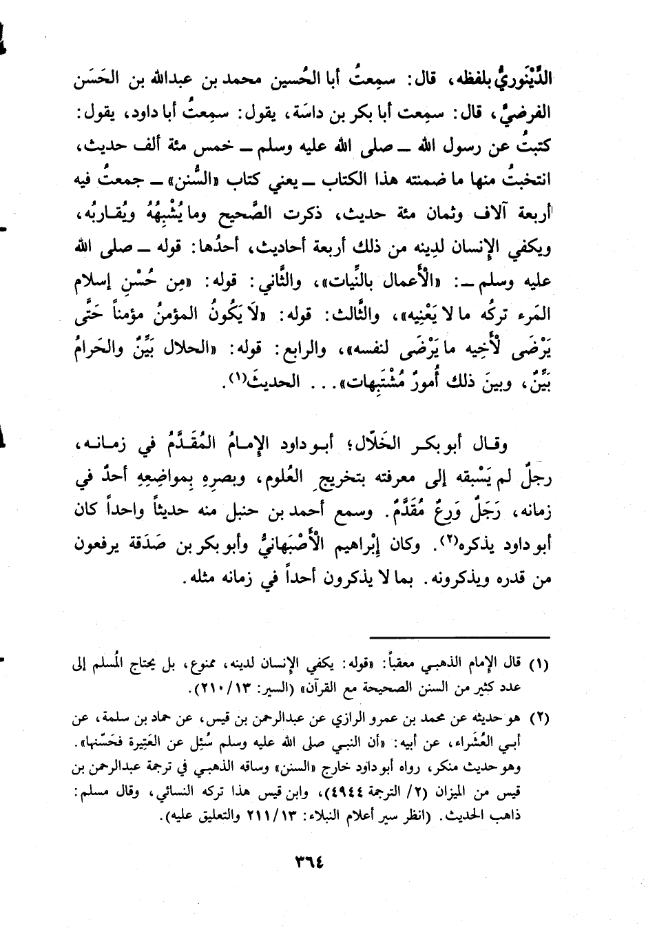 الدَّيْنَوَرِيُّ بِلَفْظِهِ، قال: سَمِعْتُ أَبَا الْحُسَيْنِ مُحَمَّدُ بْنُ عَبد اللَّهِ بْنِ الْحَسَنِ الْفَرْضِيَّ، قال: سَمِعْتُ أَبَا بَكْرِ بْنِ دَاسَةَ، يَقُولُ: سَمِعْتُ أَبَا دَاوُدَ، يَقُولُ: كَتَبْتُ عن رَسُولِ اللَّهِ صَلَّى اللَّهُ عليه وسلم خمس مئة أَلْفِ حَدِيثٍ، انْتَخَبْتُ مِنْهَا مَا ضَمّنته هذا الكتاب، يعني كتاب"السنن"- جمعت فيه أربعة آلاف وثمان مئة حديث، ذكرت الصحيح وما يشبهه ويقاربه، ويكفي الإنسان لدينه من ذلك أربعة أحاديث، أحدها: قوله صَلَّى اللَّهُ عَلَيْهِ وسَلَّمَ: الأعمال بالنيات"، والثاني: قوله: من حسن إسلام المرء تركه مالا يعنيه"، والثالث: قوله: لا يكون المؤمن مؤمنا حَتَّى يرضى لأخيه ما يرضى لنفسه"، والرابع: قوله: الحلال بين والحرام بين، وبين ذلك أمور مشتبهات" ... الحديث (1) .