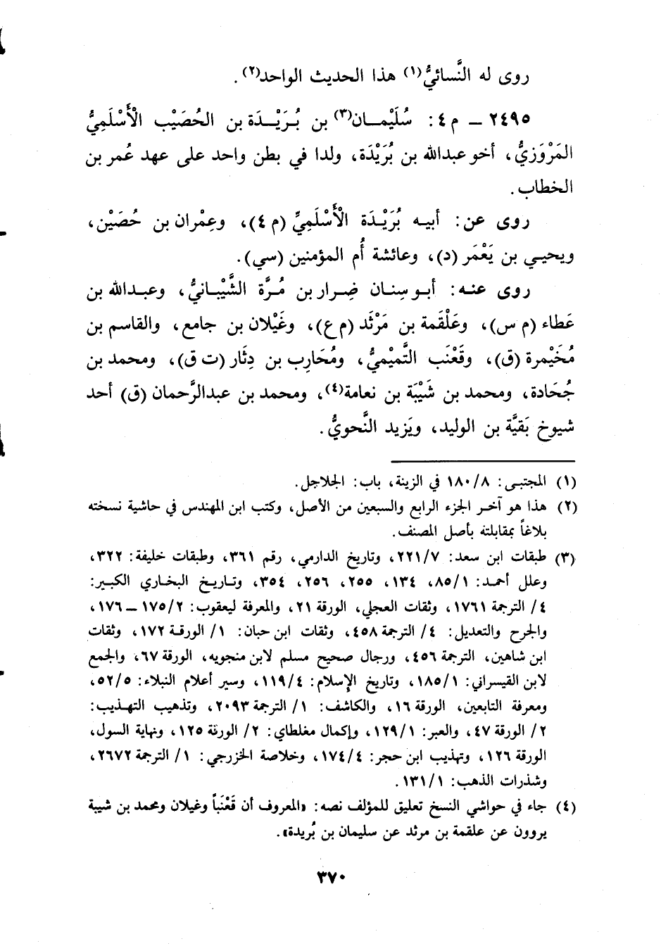 2495 - م 4: سُلَيْمان بن بريدة بن الحصيب الأَسلميّ المروزي (3) ، أخو عَبد اللَّهِ بْن بريدة، ولدا فِي بطن واحد عَلَى عهد عُمَر بْن الخطاب.