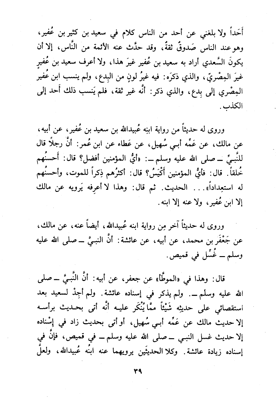 قال: وهذا فِي "الموطأ"عَنْ جَعْفَر، عَن أبيه: أن النَّبِيّ صَلَّى اللَّهُ عليه وسلم ولم يذكر فِي إسناده عائشة. ولم أجد لسَعِيد بعد استقصائي عَلَى حديثه شيئا"مما ينكر عليه أنه أتى بحديث برأسه إلا حديث مالك عَنْ عمه أبي سهيل، أو أتى بحديث زاد فِي إسناده إلا حديث غسل النَّبِيُّ صلى الله عليه وسلم فِي قميص، فإن فِي إسناده زيادة عائشة. وكلا الحديثين يرويهما عنه ابنه عُبَيد اللَّه، ولعل