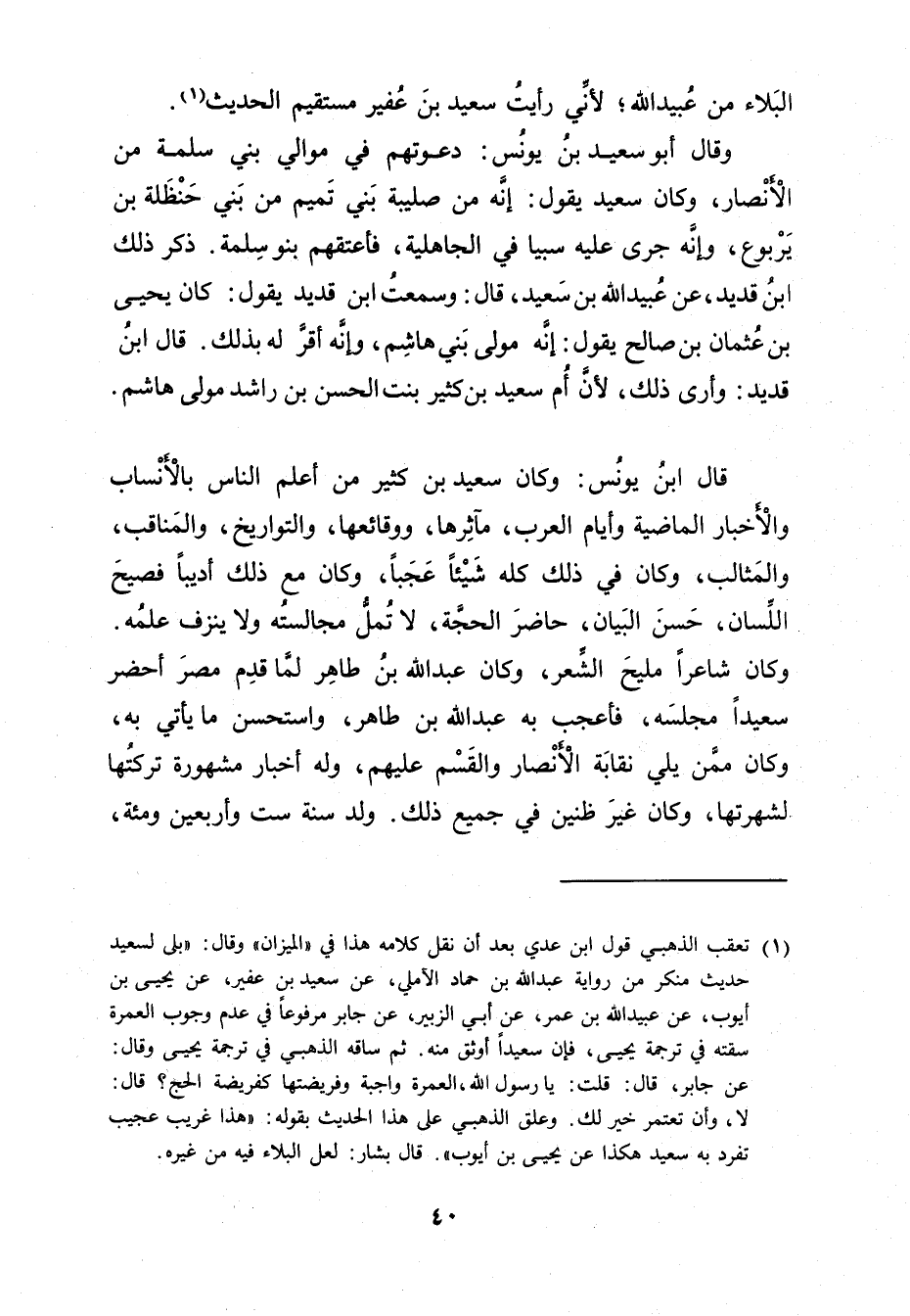 (1) تعقب الذهبي قول ابن عدي بعد أن نقل كلامه هذا في "الميزان"وَقَال: بلى لسَعِيد حديث منكر من رواية عَبد اللَّه بْن حماد الاملي، عَنْ سَعِيد بْن عفير، عَنِ يحيى بْنِ أَيُّوبَ، عَنْ عُبَيد اللَّهِ بن عُمَر، عَن أَبِي الزُّبَيْرِ، عَنْ جابر مرفوعا في عدم وجوب العُمَرة سقته في ترجمة يحيى، فإن سَعِيدا أوثق منه. ثم ساقه الذهبي في ترجمة يحيى وَقَال: عن جابر، قال: قُلْتُ: يَا رَسُولَ اللَّهِ، العُمَرة واجبة وفريضتها كفريضة الحج؟ قال: لا، وأن تعتمر خير لك. وعلق الذهبي على هذا الحديث بقوله: هذا غريب عجيب تفرد به سَعِيد هكذا عَنْ يَحْيَى بْنِ أَيُّوبَ". قال بشار: لعل البلاء فيه من غيره.