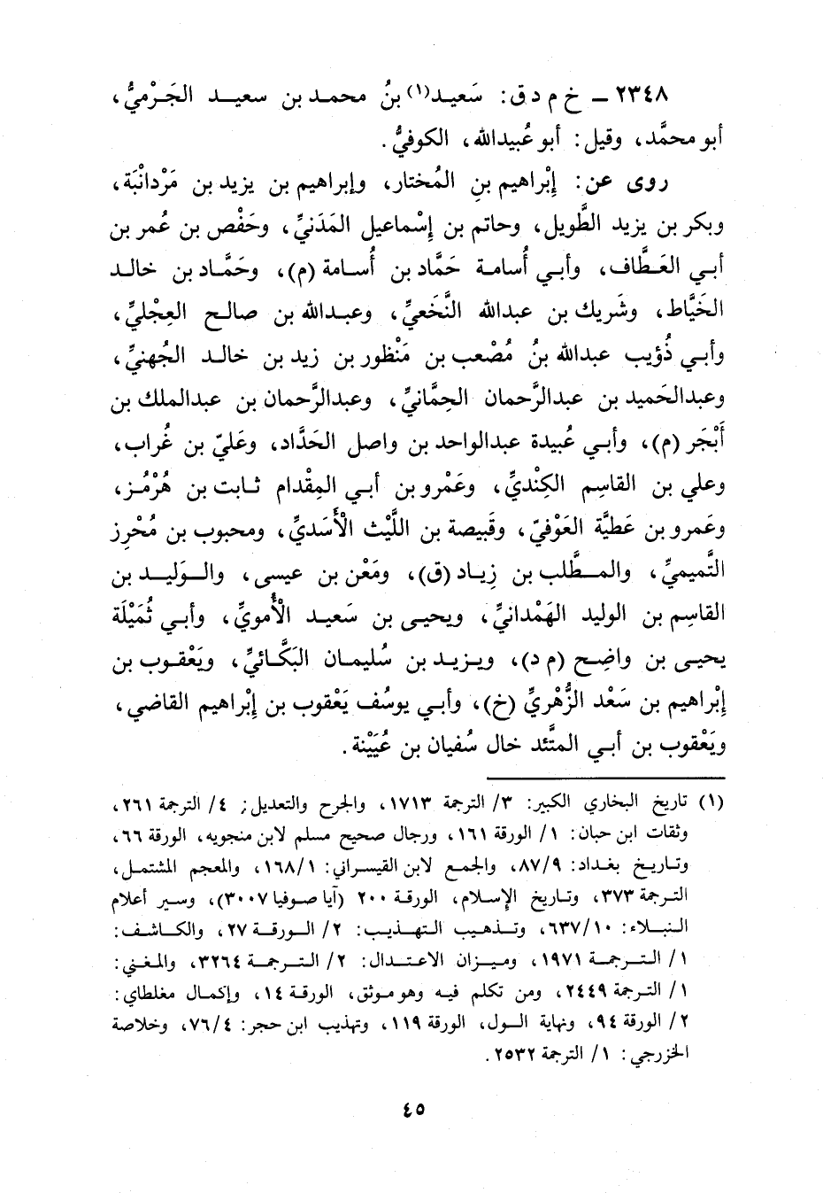 2348 - خ م د ق: سَعِيد بن مُحَمَّدِ بن سَعِيد الجرمي (1) ، أَبُو مُحَمَّد، وقيل: أَبُو عُبَيد الله، الكوفي