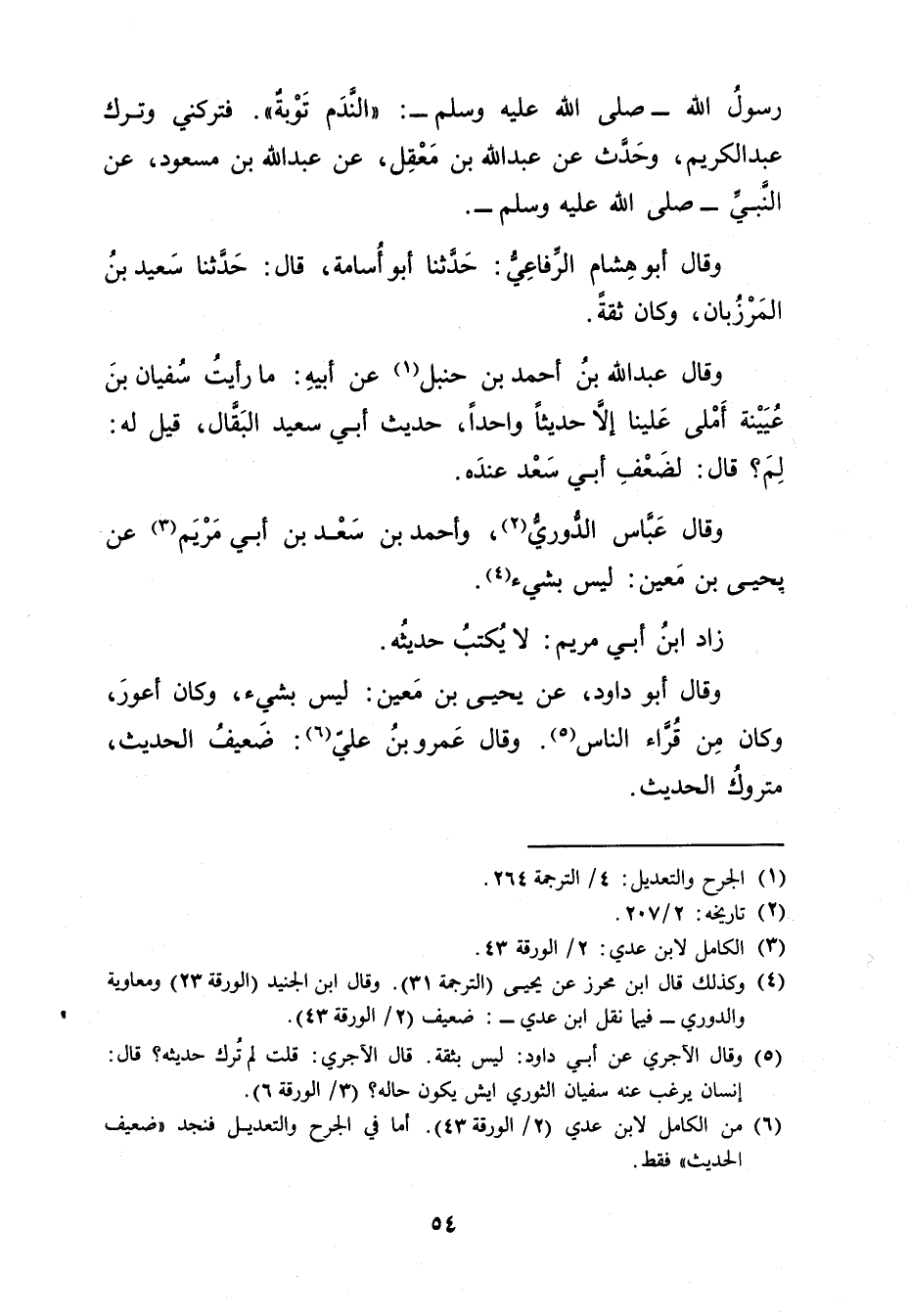 (6) من الكامل لابن عدي (2 / الورقة 43) . أما في الجرح والتعديل فنجد"ضعيف الحديث"فقط.