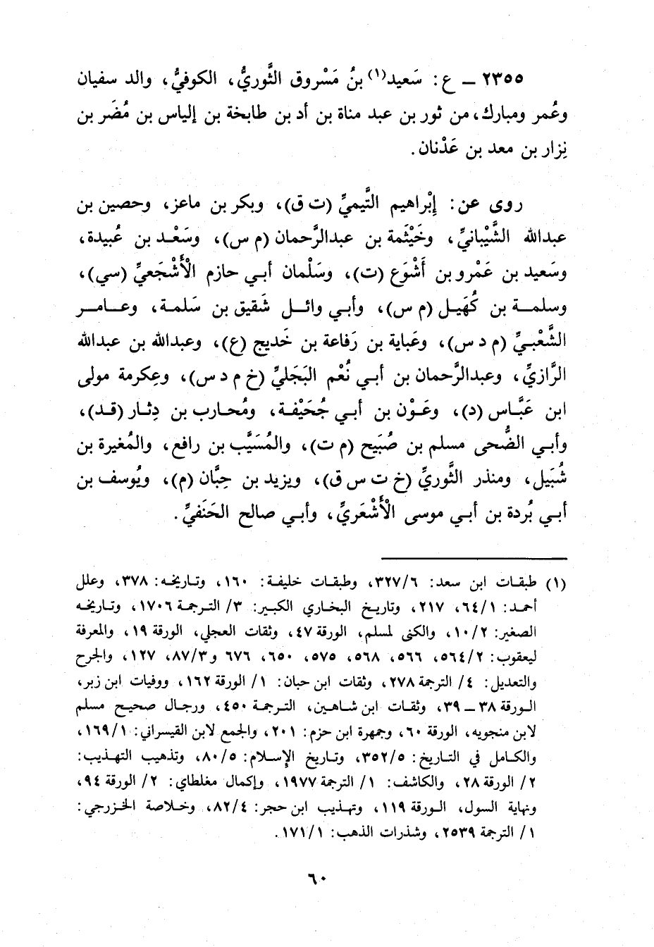 2355 - ع: سَعِيد بن مسروق الثوري (1) ، الكوفي، والد سفيان وعُمَر ومبارك، من ثور بْن عبد مناة بْن أد بْن طابخة بْن إلياس بْن مضر بْن نزار بْن معد بْن عدنان.