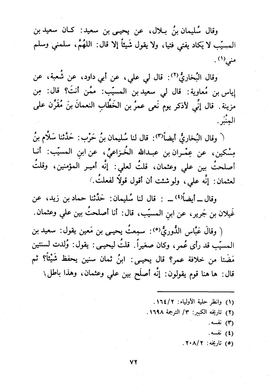 وقَال البُخارِيُّ أيضا (3) : قال لنا سُلَيْمان بْن حرب: حَدَّثَنَا سلام بْن مسكين، عن عِمْران بْن عَبد اللَّهِ الخزاعي، عَنِ ابن المُسَيَّب: أنا أصلحت بين علي وعثمان، قلت لعلي: إنه أمير المؤمنين، وقلت لعثمان: إنه علي، ولو شئت أن أقول قولا لفعلت.