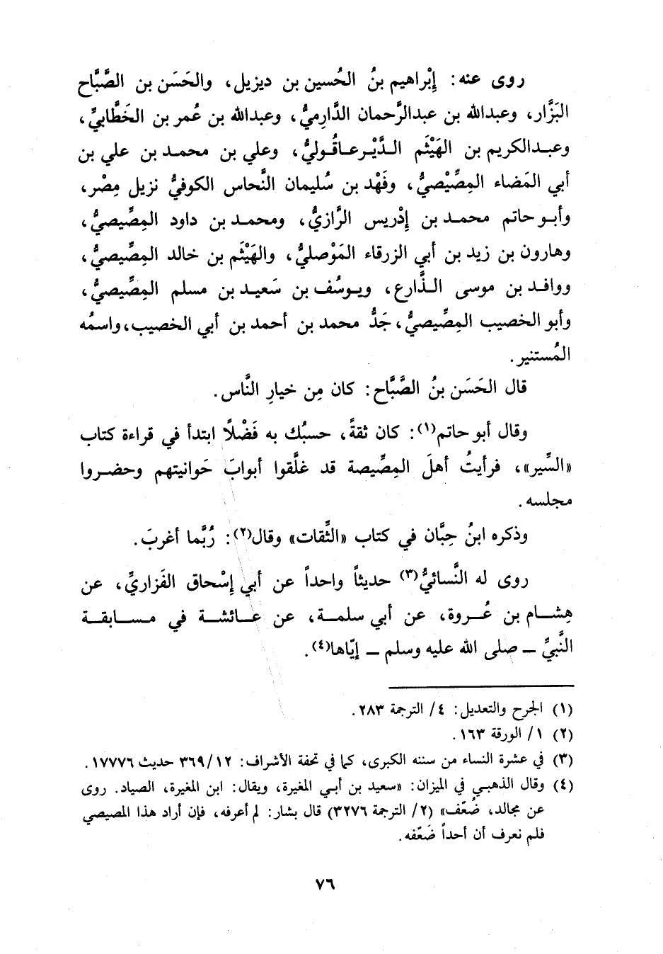 (4) وَقَال الذهبي في الميزان: سَعِيد بن أَبي المغيرة، ويُقال: ابن المغيرة، الصياد. روى عن مجالد، ضعف (2 / الترجمة 3276) قال بشار: لم أعرفه، فإن أراد هذا المصيصي فلم نعرف أن أحدًا ضعفه.