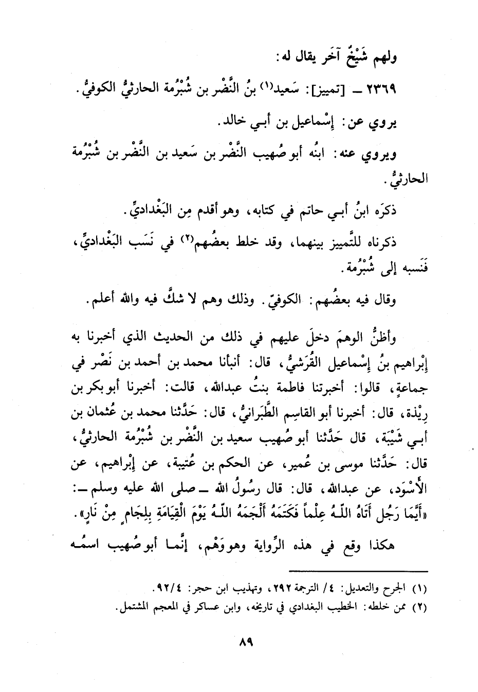 2369 - تمييز: سَعِيد بن النضر بن شبرمة الحارثي الكوفي (1) .