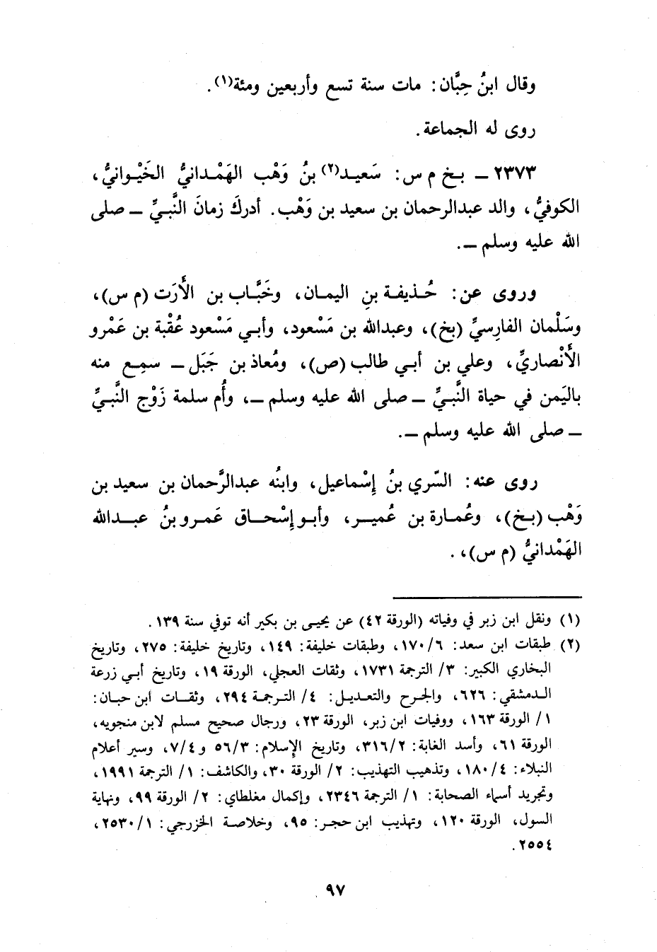 2373 - بخ م س: سَعِيد بن وهب الهمداني الخيواني (2) ، الكوفي، والد عَبْد الرَّحْمَنِ بْن سَعِيد بْن وهب. أدرك زمان النَّبِيّ صَلَّى اللَّهُ عَلَيْهِ وسَلَّمَ.