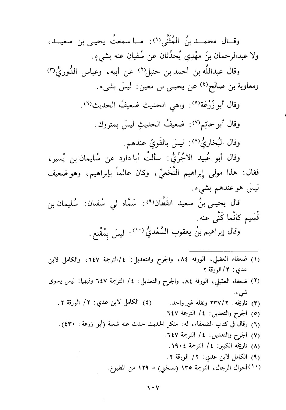 (2) ضعفاء العقيلي، الورقة 84، والجرح والتعديل: 4 / الترجمة 647 وفيهما: ليس يسوى شئ.