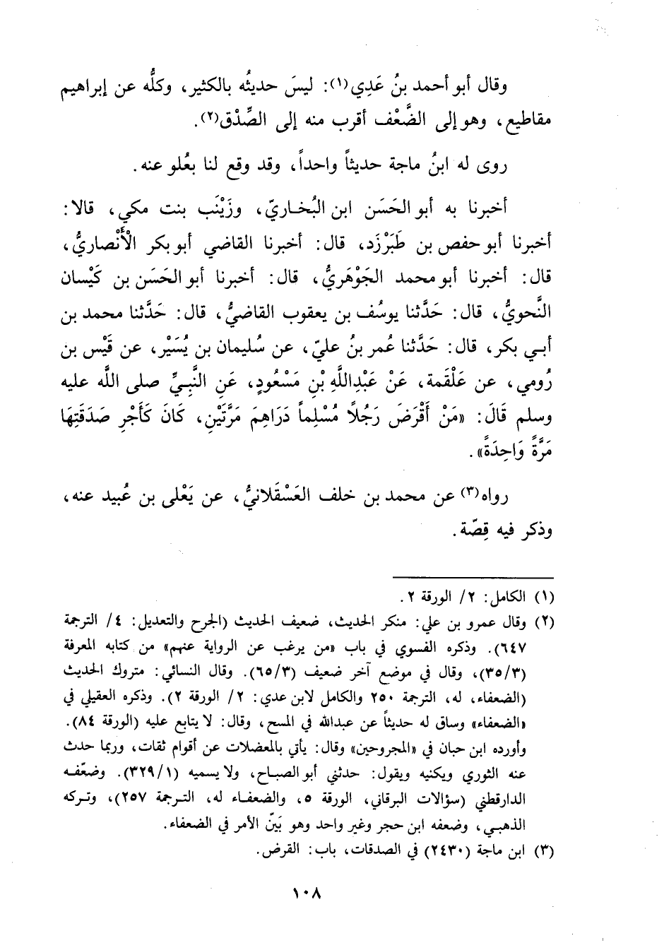 أخبرنا بِهِ أَبُو الْحَسَنِ بْنُ البخاري، وزينب بنت مكي، قَالا: أخبرنا أبو حفص بن طَبَرْزَذَ، قال: أخبرنا الْقَاضِي أَبُو بَكْرٍ الأَنْصارِيّ، قال: أخبرنا أَبُو مُحَمَّدٍ الْجَوْهَرِيُّ، قال: أخبرنا أَبُو الْحَسَنِ بْنِ كَيْسَانَ النَّحْوِيُّ، قال: حَدَّثَنَا يُوسُفُ بْنُ يَعْقُوبَ الْقَاضِي، قال: حَدَّثَنَا مُحَمَّدُ بْنُ أَبي بَكْرٍ، قال: حَدَّثَنَا عُمَر بْن علي، عَنْ سُلَيْمان بْنِ يُسَيْرٍ، عَنْ قَيْسِ بْنِ رُومِيٍّ، عَنْ عَلْقَمَةَ، عَن عَبد الله بْن مسعود، عَنِ النَّبِيِّ صلى الله عليه وسَلَّمَ قال: مَنْ أَقْرَضَ رَجُلا مُسْلِمًا دَرَاهِمَ مَرَّتَيْنِ، كَانَ كَأَجْرِ صَدَقَتِهَا مَرَّةً واحِدَةً.
