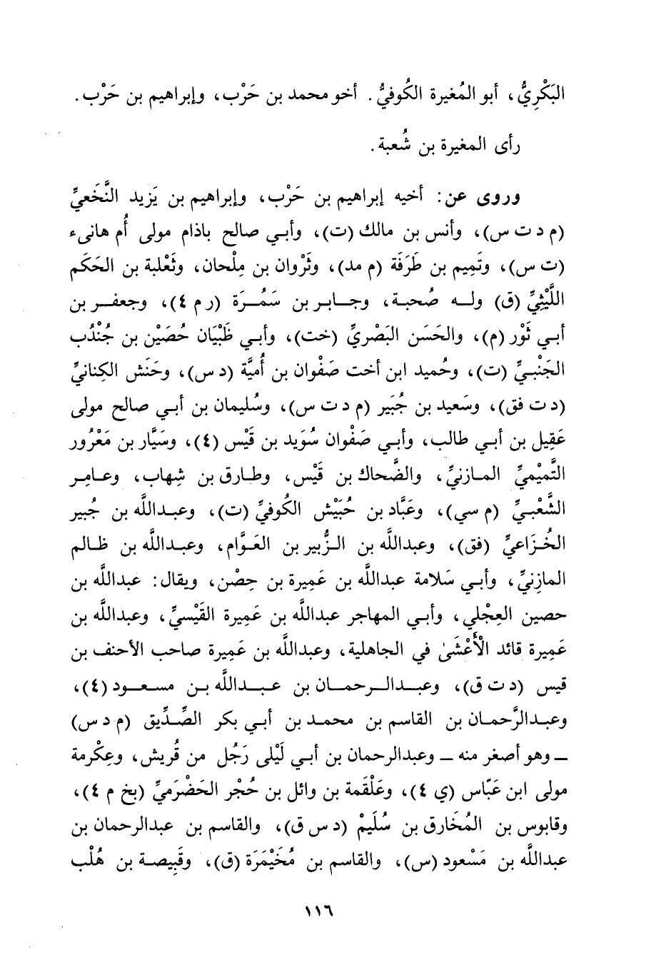 ورَوَى عَن: أخيه إبراهيم بْن حرب، وإبراهيم بْن يزيد النخعي (م د ت س) ، وأنس بْن مَالِك (ت) ، وأَبِي صالح باذام مولى أم هانئ (ت س) ، وتميم بْن طرفة (م مد) ، وثروان بْن ملحان، وثعلبة بْن الحكم الليثي (ق) ، وله صحبة، وجابر بْن سَمُرَة (ر م 4) ، وجعفر بْن أَبي ثور (م) ، والحسن البَصْرِيّ (خت) ، وأَبِي ظبيان حصين بْن جندب الجنبي (ت) ، وحميد ابْن أخت صفوان بْن أمية (د س) ، وحنش الكناني (د ت فق) ، وسَعِيد بْن جبير (م د ت س) ، وسُلَيْمان بْن أَبي صالح مولى عقيل بْن أَبي طالب، وأَبِي صفوان سويد بْن قيس (4) ، وسَيَّار بْن معرور التميمي المازني، والضحاك بْن قيس، وطارق بْن شهاب، وعامر الشعبي (م سي) ، وعباد بْن حبيش الكوفي (ت) ، وعَبْد اللَّهِ بْن جبير الخزاعي (فق) ، وعَبْد اللَّهِ بْن الزبير بْن العوام، وعَبْد اللَّهِ بْن ظالم المازني، وأَبِي سلامة عَبد اللَّهِ بْن عميرة بْن حصن، ويُقال: عَبد اللَّهِ بْن حصين العجلي، وأَبِي المهاجر عَبد اللَّهِ بْن عميرة القيسي، وعَبْد اللَّهِ بْن عميرة قائد الأعشى فِي الجاهلية، وعَبْد اللَّهِ بْن عميرة صاحب الأَحنف بْن قيس (د ت ق) ، وعَبْد الرَّحْمَنِ بْن عَبد اللَّهِ بْن مسعود (4) ، وعَبْد الرَّحْمَنِ بْن الْقَاسِم بْن مُحَمَّد بْن أَبي بَكْرٍ الصديق (م د س) - وهو أصغر منه - وعَبْد الرحمن بْن أَبي ليلى رجل من قريش، وعكرمة مولى ابْن عباس (ي 4) ، وعلقمة بْن وائل بْن حجر الحضرمي (بخ م 4) ، وقابوس بْن المخارق بْن سليم (د س ق) ، والقاسم بْن عَبْد الرَّحْمَنِ بْن عَبد اللَّهِ بْن مسعود (س) ، والقاسم بْن مخيمرة (ق) ، وقبيصة بْن هلب