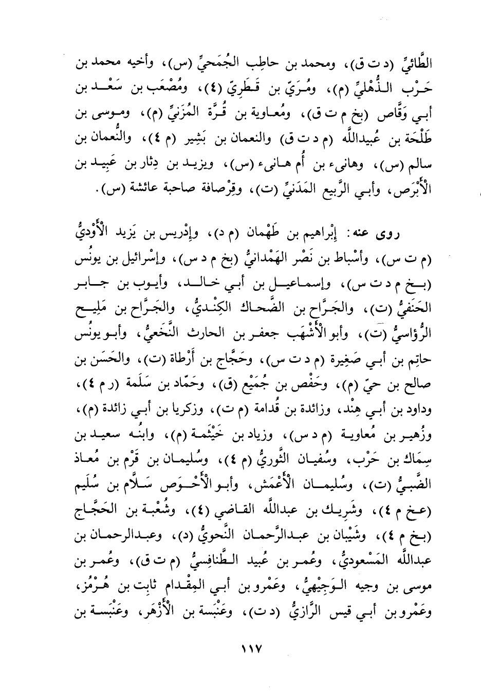 الطائي (د ت ق) ، ومحمد بْن حاطب الجمحي (س) ، وأخيه مُحَمَّد بْن حرب الذهلي (م) ، ومري بْن قطري (4) ، ومصعب بْن سعد بن أَبي وقاص (بخ م ت ق) ، ومعاوية بْن قرة المزني (م) ، وموسى بْن طلحة بْن عُبَيد اللَّه (م د ت ق) والنعمان بْن بشير (م 4) ، والنعمان بْن سالم (س) ، وهانئ بن أم هانئ (س) ، ويزيد بْن دثار بْن عُبَيد بْن الابرص، وأَبِي الربيع المدني (ت) ، وقرصافة صاحبة عائشة (س) .