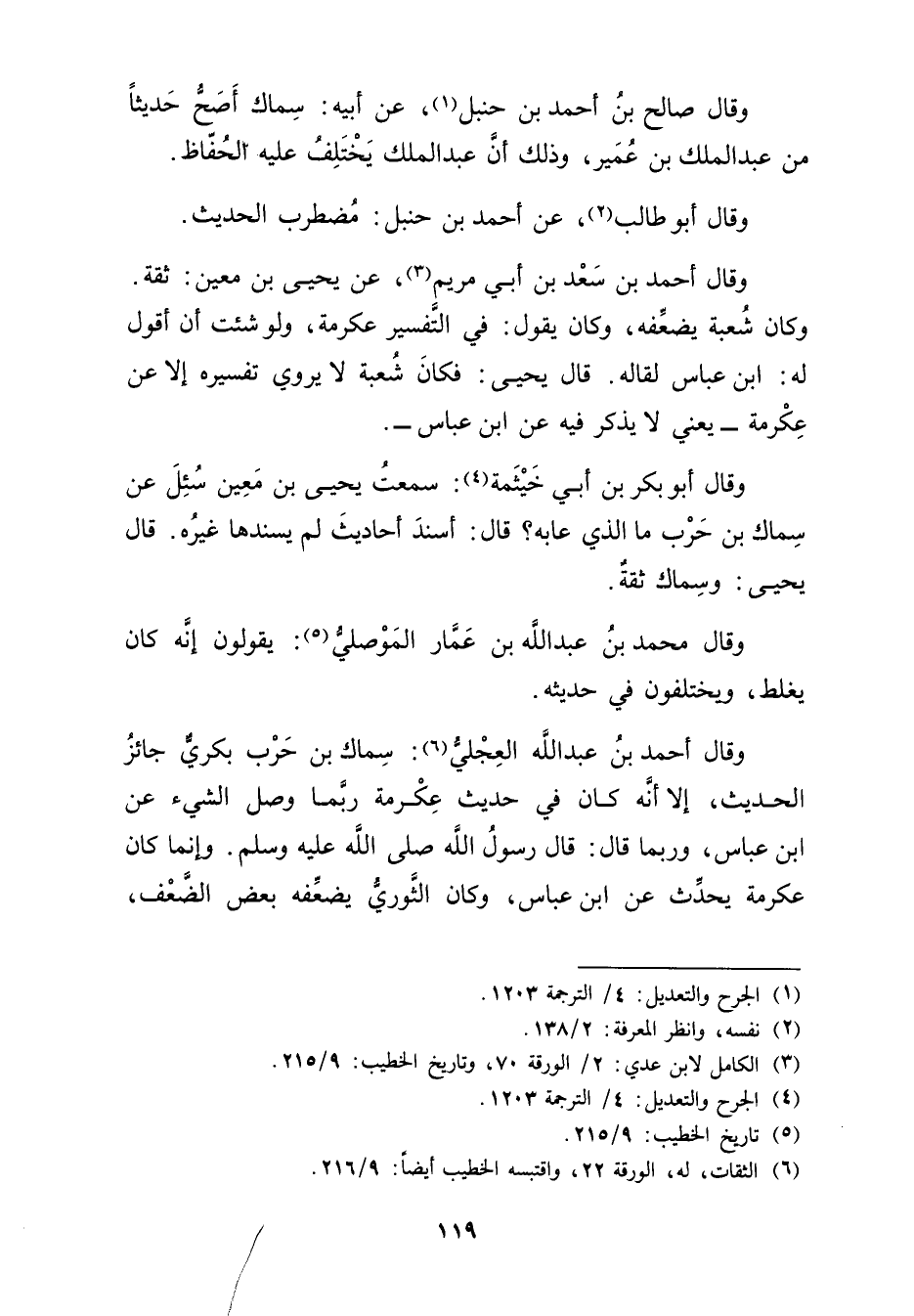 وَقَال أَحْمَد بْن عَبد اللَّهِ العجلي (6) : سماك بْن حرب بكري جائز الحديث، إلا أنه كَانَ فِي حديث عكرمة ربما وصل الشئ عَنِ ابن عباس، وربما قال: قال رَسُولُ اللَّهِ صلى الله عَلَيْهِ وسَلَّمَ. وإنما كَانَ عكرمة يحدث عَنِ ابن عباس، وكَانَ الثوري يضعفه بعض الضعف،
