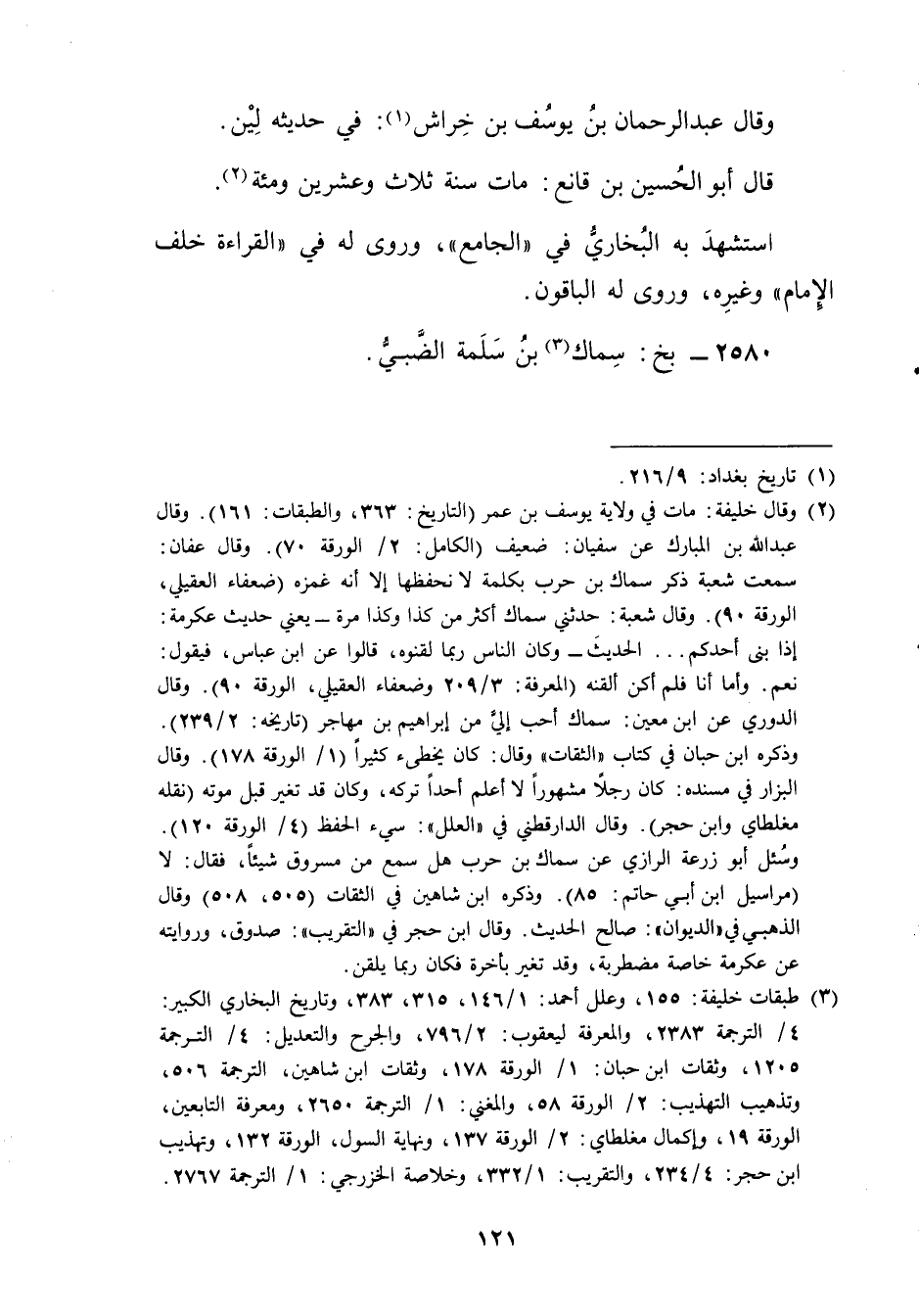 (2) وَقَال خليفة: مات فِي ولاية يُوسُف بْن عُمَر (التاريخ: 363، والطبقات: 161) . وَقَال عَبد الله بْن المبارك عن سفيان: ضعيف (الكامل: 2 / الورقة 70) . وَقَال عفان: سمعت شعبة ذكر سماك بن حرب بكلمة لانحفظها إلا أنه غمزه (ضعفاء العقيلي، الورقة 90) . وَقَال شعبة: حدثني سماك أكثر من كذا وكذا مرة، يعني حديث عكرمة: إذا بني أحدكم ... الحديث - وكان الناس ربما لقنوه، قالوا عن ابن عباس، فيقول: نعم. وأما أنا فلم أكن ألقنه (المعرفة: 3 / 209 وضعفاء العقلي، الورقة 90) . وَقَال الدوري عن ابن مَعِين: سماك أحب إلي من إبراهيم بن مهاجر (تاريخه: 2 / 239) ، وذَكَره ابنُ حِبَّان في كتاب "الثقات" وَقَال: كان يخطئ كثيرا (1 / الورقة 178) . وَقَال البزار في مسنده: كان رجلا مشهورا لا أعلم أحدًا تركه، وكان قد تغير قبل موته (نقله مغلطاي وابن حجر) . وَقَال الدَّارَقُطْنِيُّ في "العلل": سئ الحفظ (4 / الورقة 120) .