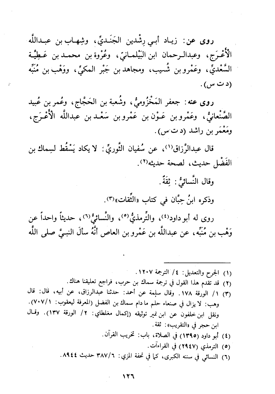 (3) 1 / الورقة 178. وَقَال سلمة عن أحمد: حَدَّثَنَا عبد الرزاق، عَن أبيه، قال: قال وهب: لا يزال في صنعاء حلم ما دام سماك بن الفضل (المعرفة ليعقوب: 1 / 707) . ونقل ابن خلفون عن ابن نمير توثيقه (إكمال مغلطاي: 2 / الورقة 137) . وَقَال ابن حجر في "التقريب": ثقة.