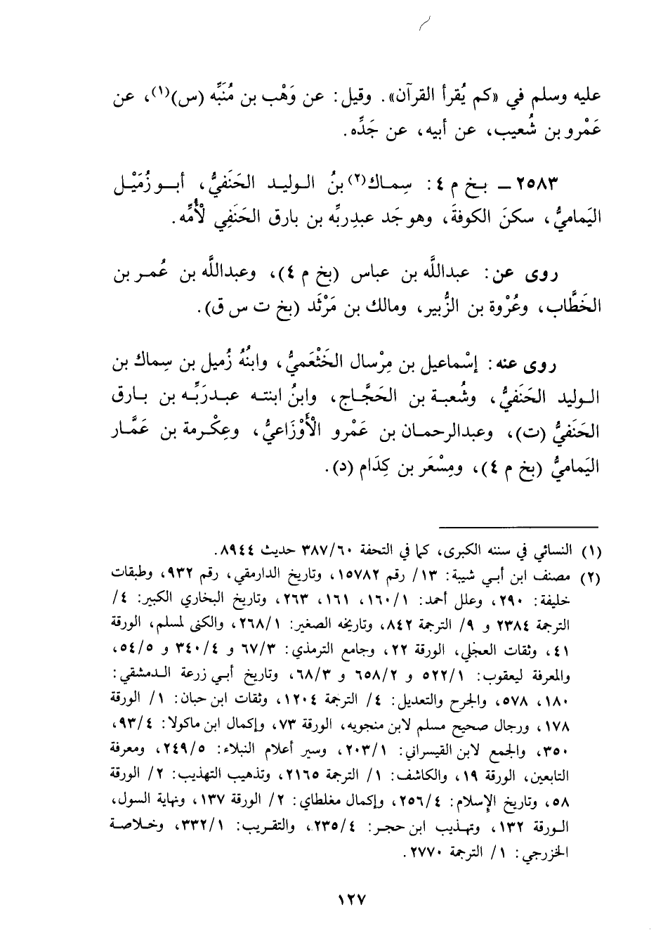 2583 - بخ م 4: سماك بن الْوَلِيد الحنفي (2) ، أَبُو زميل اليمامي، سكن الكوفة، وهو جد عَبْد ربه به بارق الحنفي لامه.