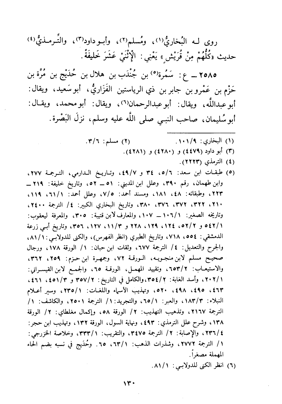 2585 - ع: سَمُرَة بن جندب بن هلال بن حديج بن مرة بن حزم بن عَمْرو بن جابر بن ذي الرياستين الفزاري (5) ، أبو سَعِيد، ويُقال: أبو عَبْد اللَّهِ، ويُقال: أَبُو عبد الرحمن (6) ، ويُقال: أبو مُحَمَّد، ويُقال: أبو سُلَيْمان، صاحب النَّبِيّ صَلَّى اللَّهُ عليه وسلم، نزل البصرة.