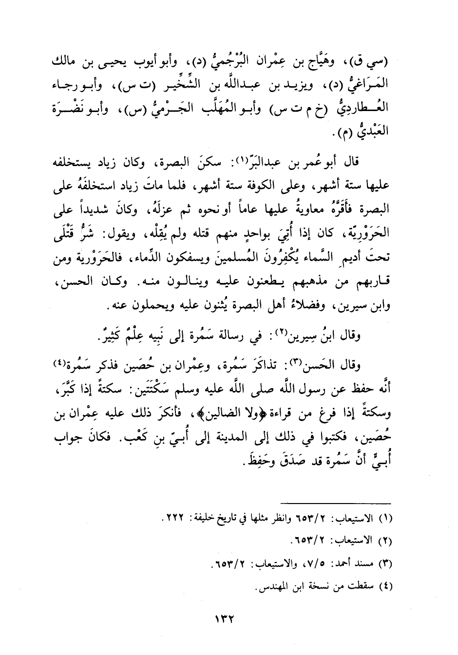(1) الاستيعاب: 2 / 653 وانظر مثلها في تاريخ خليفة: 222.